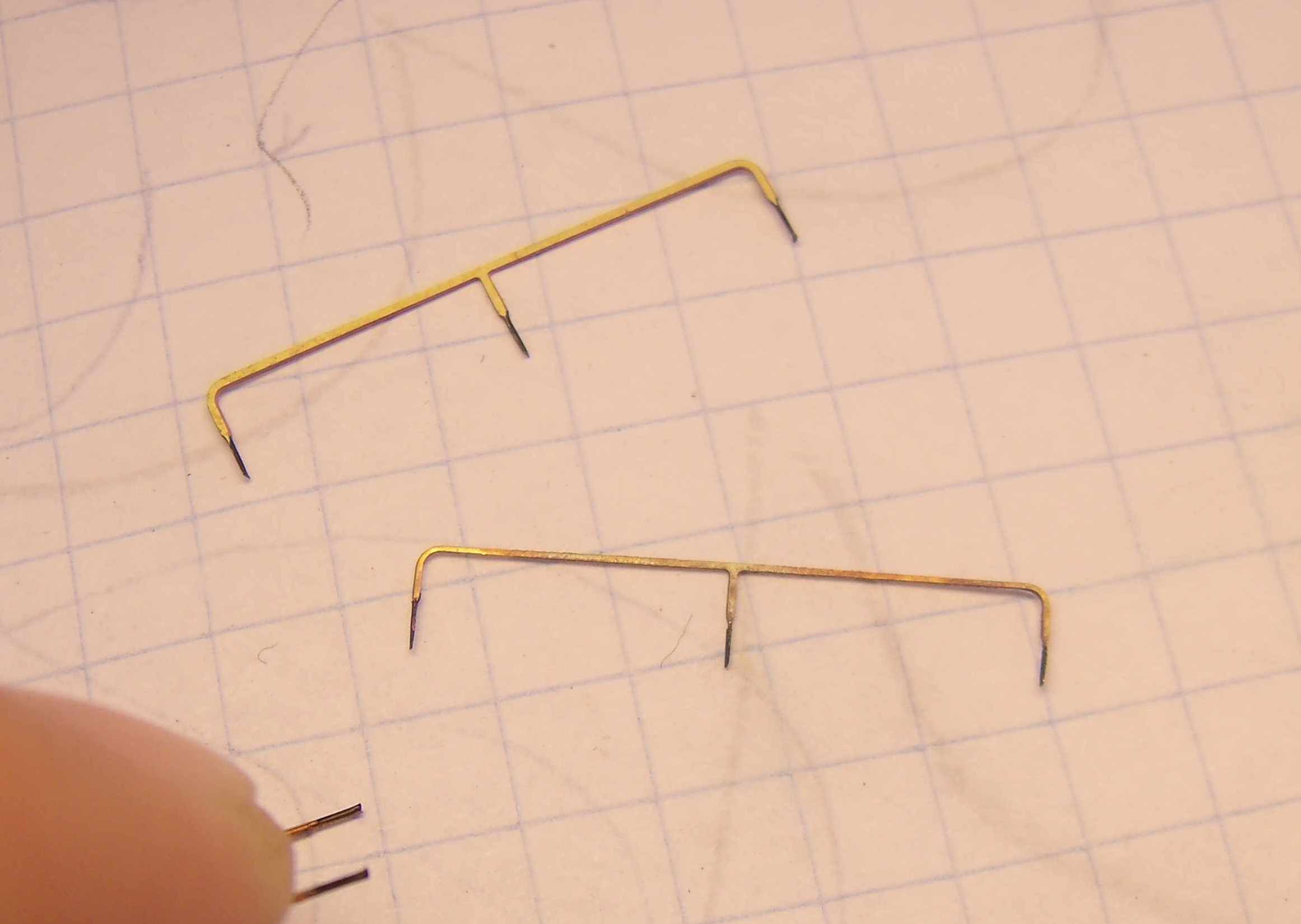 Нагнул поручней. Дверные поручни "хром" - это сталистая проволока, жёсткая, упругая, форму сохраняет даже при весьма сильном воздействии. Лобовой попробовал тоже из неё гнуть, но жутко не удобно оказалось его так выгибать и вставлять, один только сделал, второй лобовой из медной проволки....