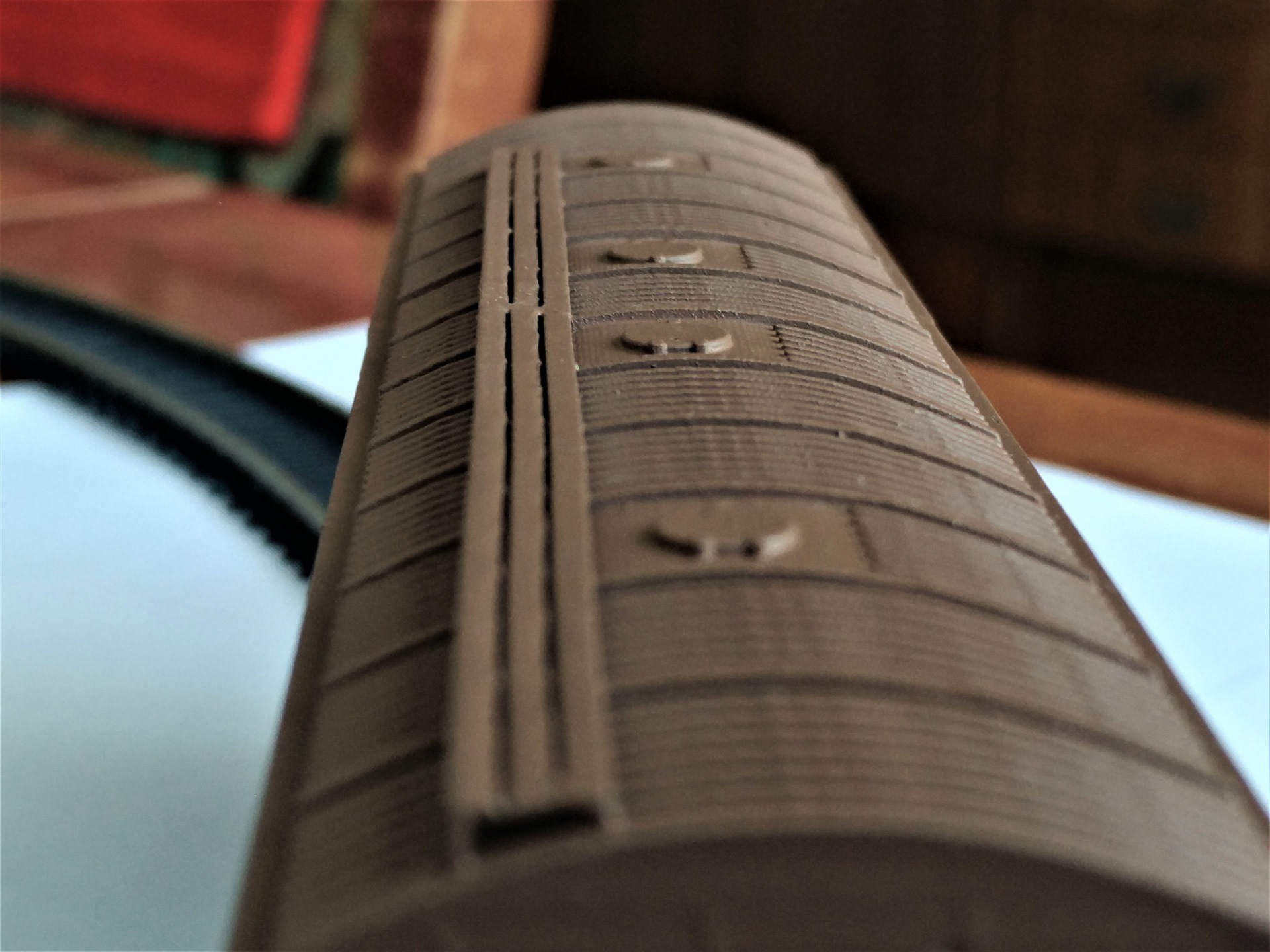 Осваиваю печать на фотополимерном 3D принтере. Для пробы пера была взята модель грузового вагона 11-270. Автор 3D модели Polkin https://cults3d.com/en/3d-model/various ... ar-1-87-h0. Детализацией не заморачивался. Это первый мой опыт, и мне важно было понять получится ли вообще что-нибудь. Корпус вагона печатался отдельными стенками и потом склеивался. Так как габариты вагона не помещаются в область печати принтера, пришлось длинные стенки, днище и крыщу печатать из двух частей и склеивать. В этом я еще не очень опытен, поэтому можно наблюдать места склейки. Крыша вагона не приклеена из соображений дальнейших экспериментов. Так что щель между стенками и крышей это не косяк.