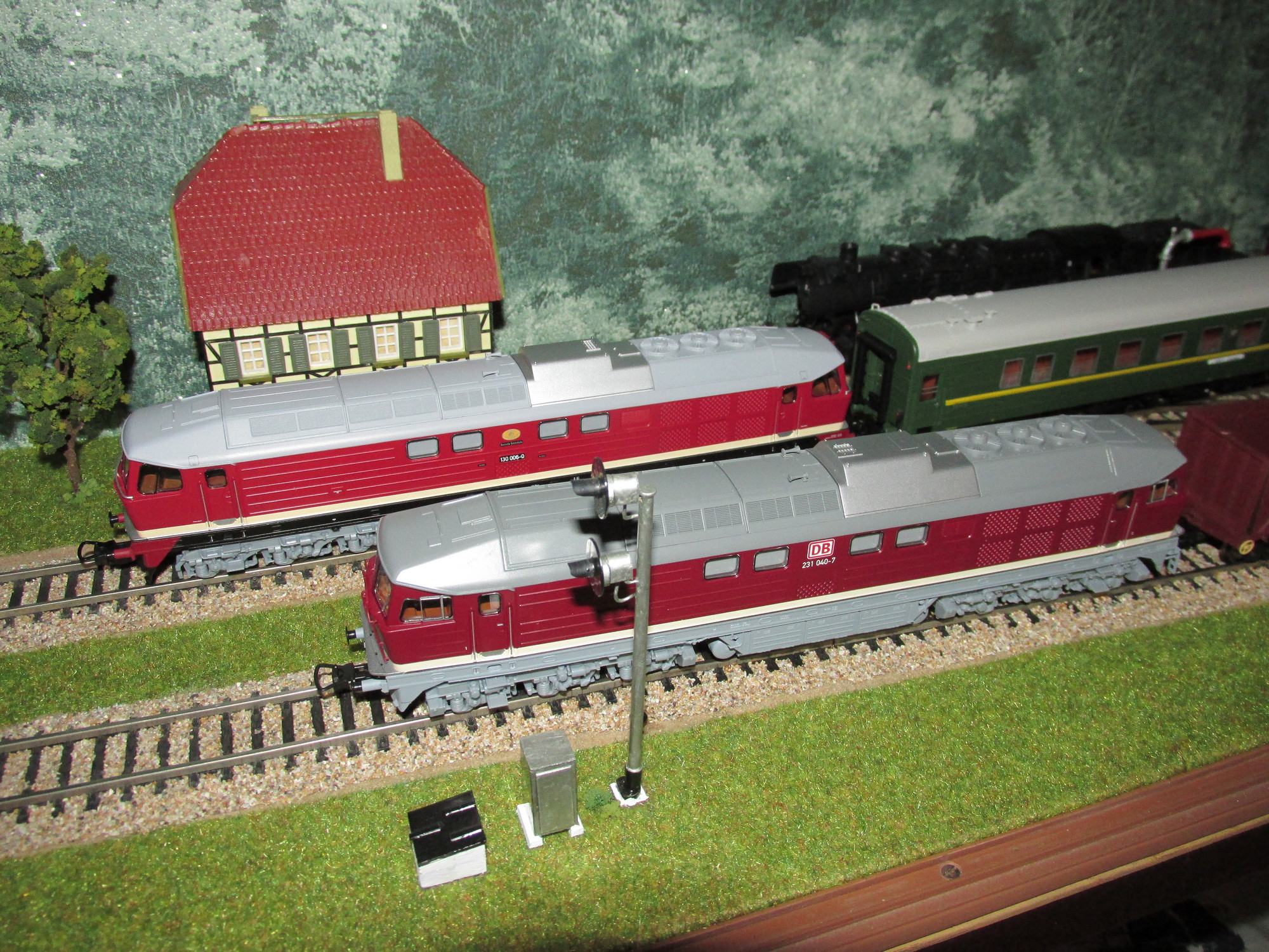 Едем дальше! Сегодня хочу представить "Людмилы" модернизированной серии 234. Прекрасный набор от Brawa включает сразу три модели тепловозов этой серии. Но сперва, как всегда, немного истории. После объединения двух Германий, получило развитие скоростное пассажирское сообщение и для вождения поездов-экспрессов понадобились мощные тепловозы с конструкционной скоростью 140 км/ч. Для этой цели было решено произвести модернизацию серийных тепловозов серии 132 (232), повысив их максимальную скорость до 140, путём применения элементов экипажной части (тяговых редукторов) от отставленных на тот момент машин серии 130 (230). С 1991 до 1996 таким образом было перестроено 64 локомотива. При выполнении данной модернизации, дизели на тепловозах были оставлены штатные, 5Д49, кроме шести машин, которые получили новые дизели другого типа. Дело в том, что дизель 5Д49 для устойчивой и безаварийной работы требовал довольно частого и затратного технического обслуживания, а по ряду эксплуатационных показателей и по надёжности уступал лучшим мировым образцам. Естественно, у эксплуатационников возникло желание заменить дизели типа Д49 на "Людмилах" более лучшими и надёжными. С целью провести сравнительные испытания и выбрать лучший тип дизеля для ремоторизации тепловозов, шесть машин серии 234 были оснащены новыми дизелями: 234 548 и 565 - CAT 3608, 234 555 и 630 - MaK 12M282L, 234 440 и 657 - новыми коломенскими дизелями 12Д49. Модели именно таких модернизированных тепловозов и представлены в наборе от Brawa. Приобретён 08.12.2011.