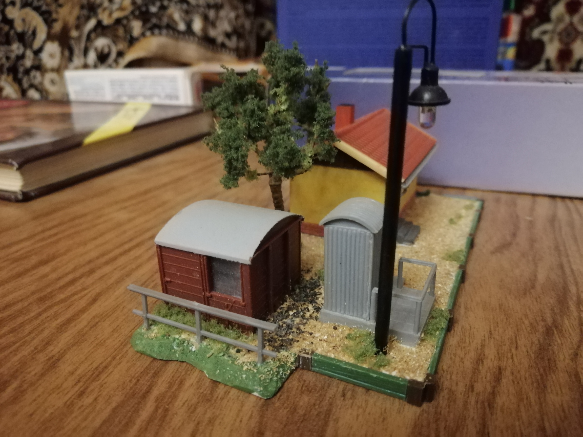 дежурного переезда .Собрал в кучу .посадил дерево. Для переезда слишком круто.Покурил -пришла мысля для будущего макета . Дом смотрителя тонеля и стрелок если они возле него будут. по случаю прикупил старрый кит мамоса с телефонной будкой. врезал в дверь будки окошко для красоты.Воткнул фонарь что бы освещал територию-вобщем получилась такая диорамка.