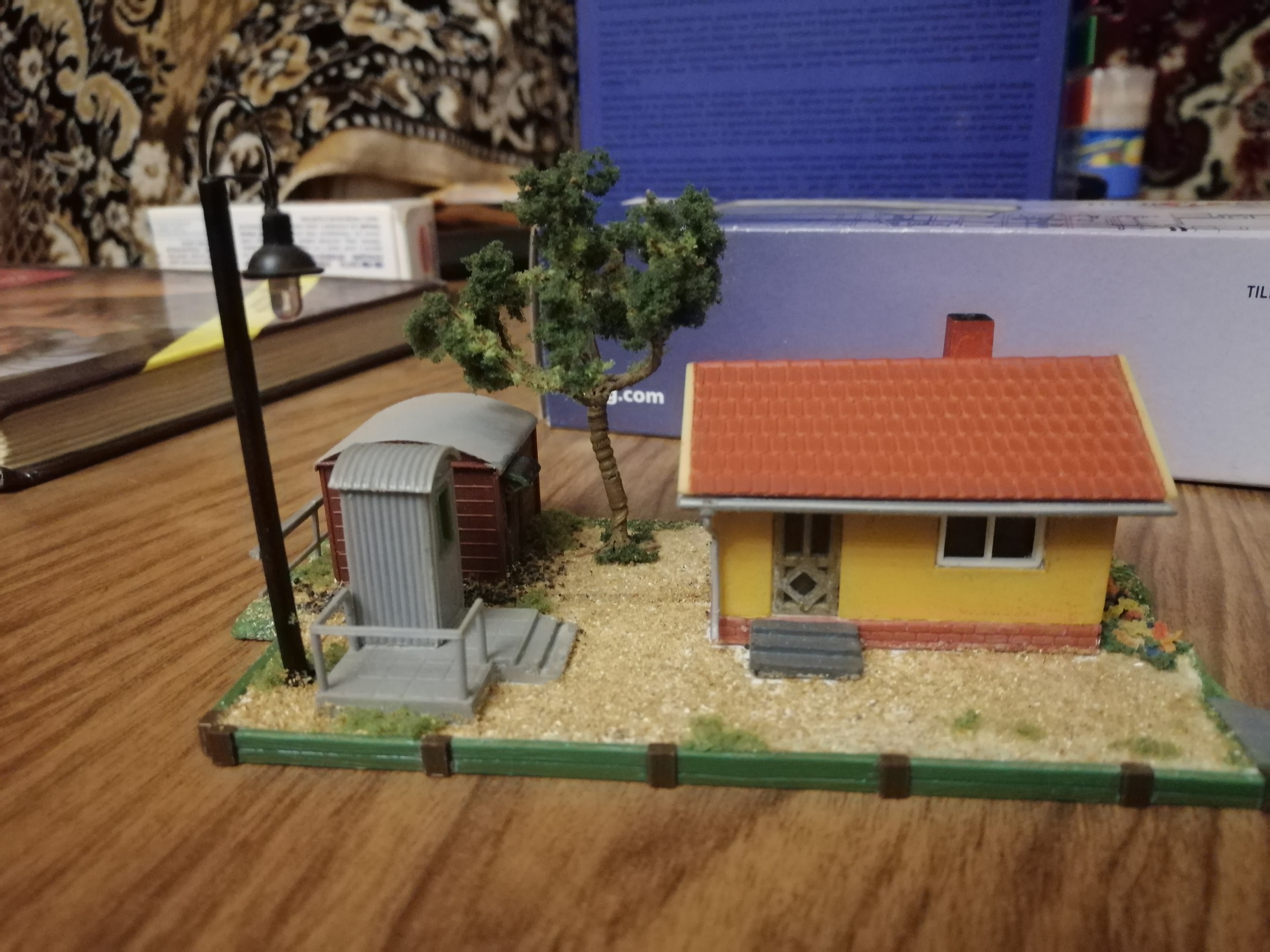 дежурного переезда .Собрал в кучу .посадил дерево. Для переезда слишком круто.Покурил -пришла мысля для будущего макета . Дом смотрителя тонеля и стрелок если они возле него будут. по случаю прикупил старрый кит мамоса с телефонной будкой. врезал в дверь будки окошко для красоты.Воткнул фонарь что бы освещал територию-вобщем получилась такая диорамка.