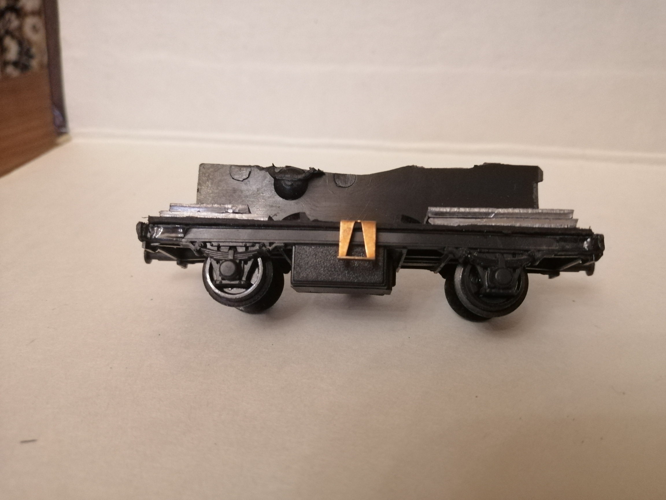 Сломаные буфера решил не востанавливать просто рассверлил дырочки-будем считать немцы сняли на свои нужды. Такие вагоны всеравно годами стоят в тупиках. За выходной сделал кузов-трап надсройки на крыше из тех же дискет и покрасил. Пол ночи из литников точил изоляторы