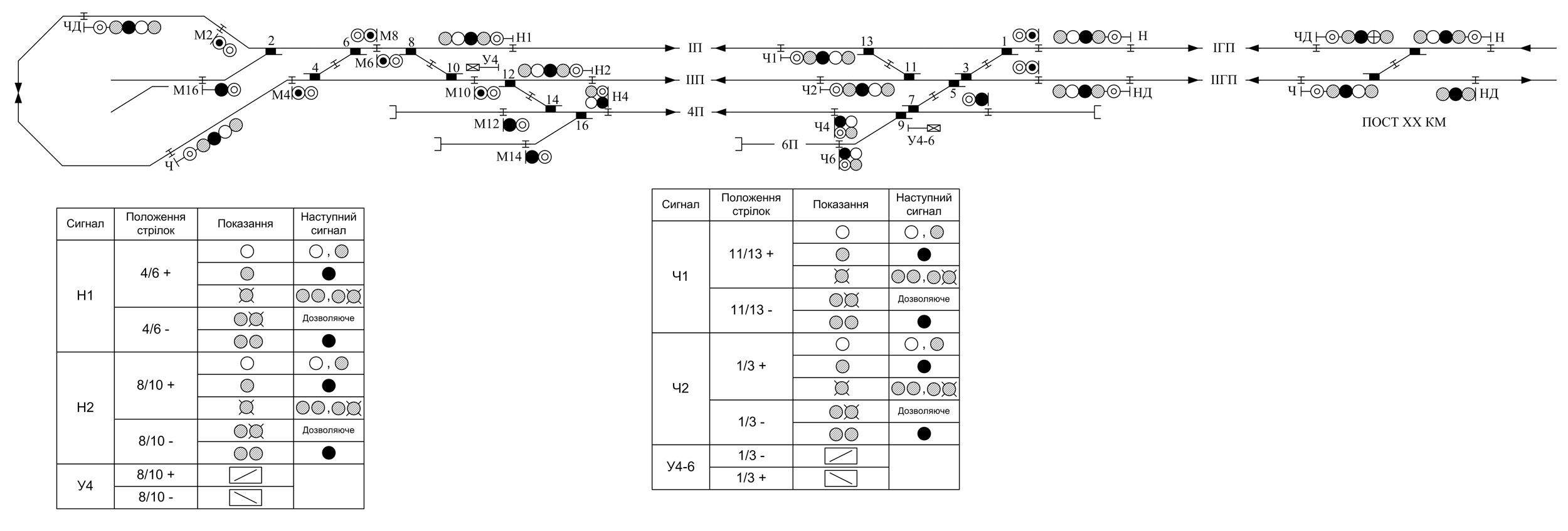 Тут все звичайне, в табличках відображено. Ж(м) на вихідних у випадку відсутності петлі і наступним буде вхідний сусідньої станції. Своєї по петлі може бути тільки для Н1 коли по Ч будуть приймати на 4 колію. Для Н2 при 8/10 в мінусовому Ч відкрити не можна, тому тільки варіант з перегоном.