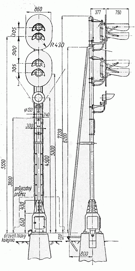 Вот чертёж (это чертёж светофора советского производства, применявшегося в Чехословакии, поэтому козырёк головки пригласительного огня короткий):