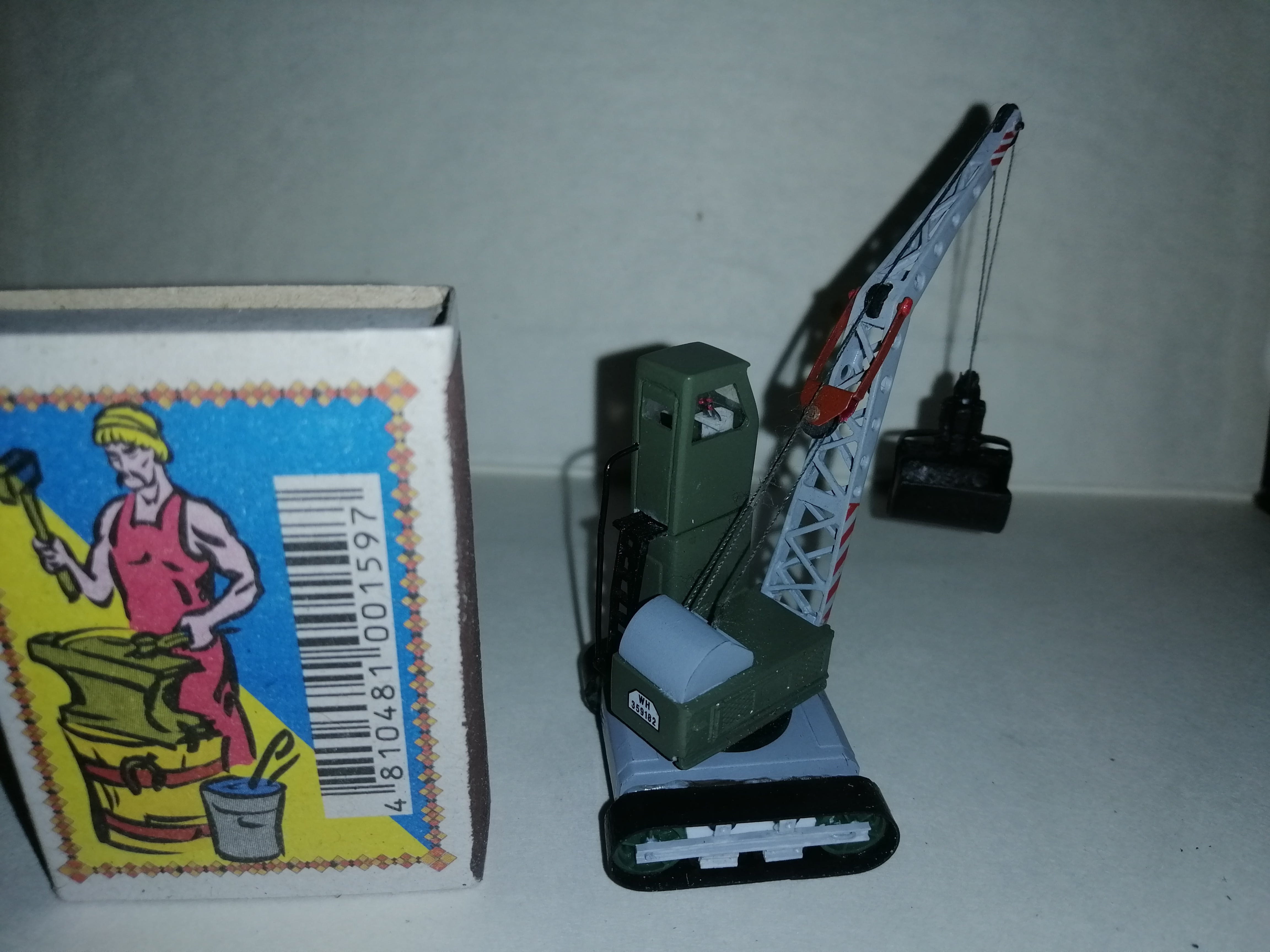 Вибачайте що грейфер трохи фантазійний -3Д принтера не маю тож зробив настільки дозволяли руки. Відповідають лише розміри. Поки сохла фарба примостачив драбину з поручнем . Ну і посватав ходову з поворотним верхом. Ну і після перекура півгодини колупався з тросами що б підіймалась та оускалась стріла та грейфер. Вийшло таке "чудо-юдо".