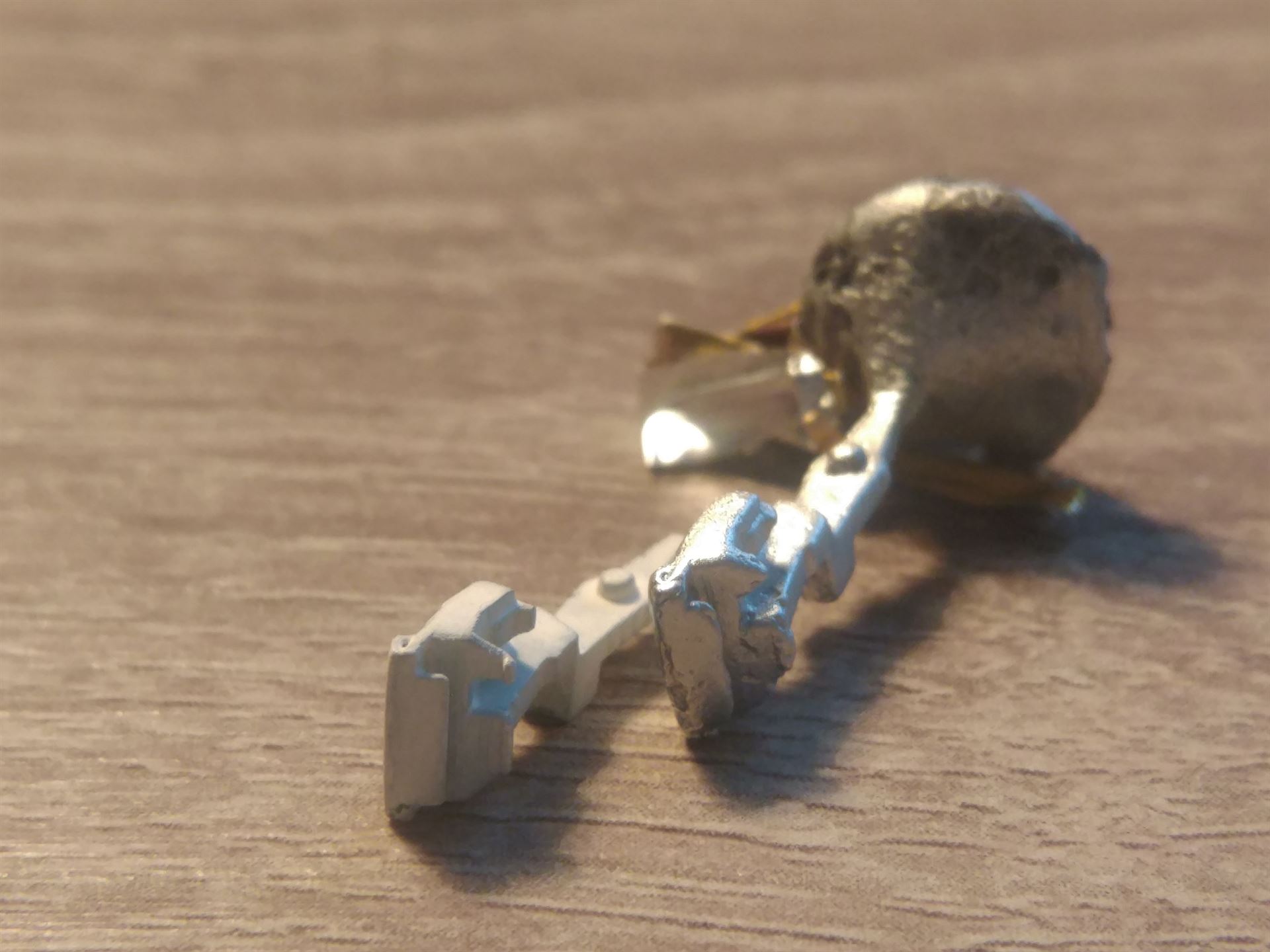 Первая проба отлить сцепку в металле. Это одна из частей сцепки (вариант под NEM шахту). Пока не идеально, но результат меня порадовал. Использовал сплав ЦАМ. Думал, вообще ни чего не выйдет. Так как все делалось из подручных средств. Опока из простого гипса. Модель из обычного свечного парафина. На фото, рядом мастер-модель из фотополимера.