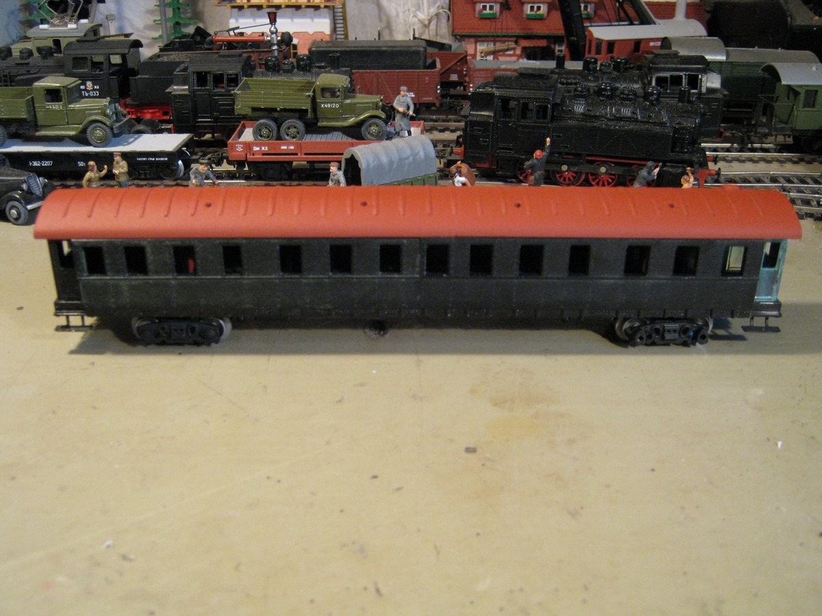 Надо было разрезать вагоны так, чтобы узкие окна гальюнов оказались возле тамбуров, а десять окон побольше должны быть расположены с одинаковыми интервалами. В итоге вагон получился длиной 207 мм, хотя 20,2м в 1:87 должно быть 232 мм. Ещё и габарит европейский. Успокоил совесть тем, что подобные вольности являются нормальной практикой для KLEINBAHN . Заготовка получилась такая. Нужны тележки от любого четырёхосного пассажира Oldtimer.