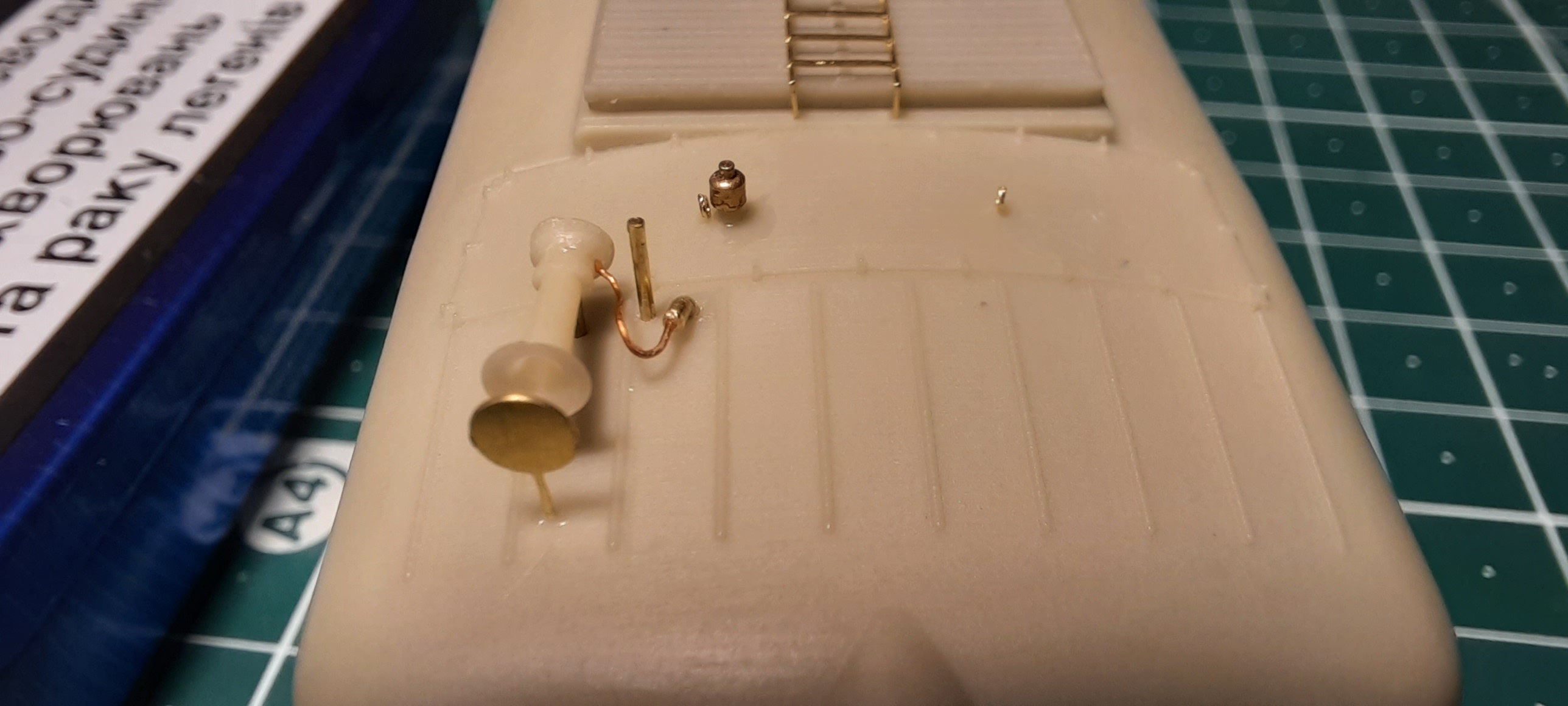 Потом решил логически завершить "тифонный узел", добавив какие-то непонятные штыри рядом с тифонами, опять же замеченные на любом крышевом фото лока, и шланги с торчащими из крыши кранами (я так понимаю, подачи воздуха). Краны делал из медной проволоки 0.7 мм, шланги из проволоки 0.25 мм. Самым кропотливым был процесс высверливания в торце проволоки 0.7 отверстия под 0.25.