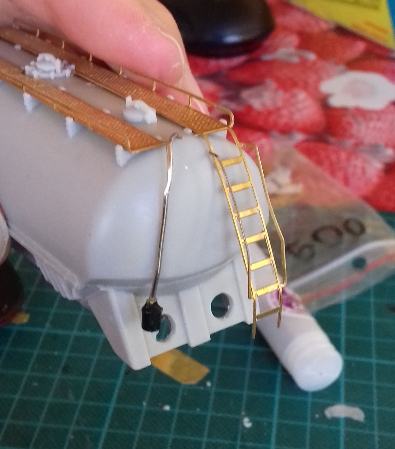 Обилие травла сначала испугало. Памятуя попытки работать с тем, что вкладывает в киты Камушкин и Бражник, ожидал длительного интима. Однако ничего подобного: материал толще и не ломается с первой попытки его гнуть. Оказалось, травлёные детали хорошая штука, если они не говно. Пришлось повозится, очищая от облоя трубопроводы. Качество литья не ахти, но с этим тоже как-то справился. Также понадобилось изготовить воздухопровод сброса давления (именно его не хватало). Взял толстую проволоку и кусок пластика. Вышло грубовато, но увы - выготовить столь мелкие элементы пока не под силу.