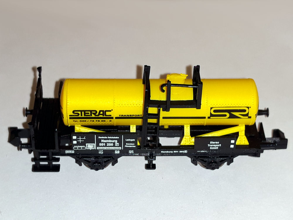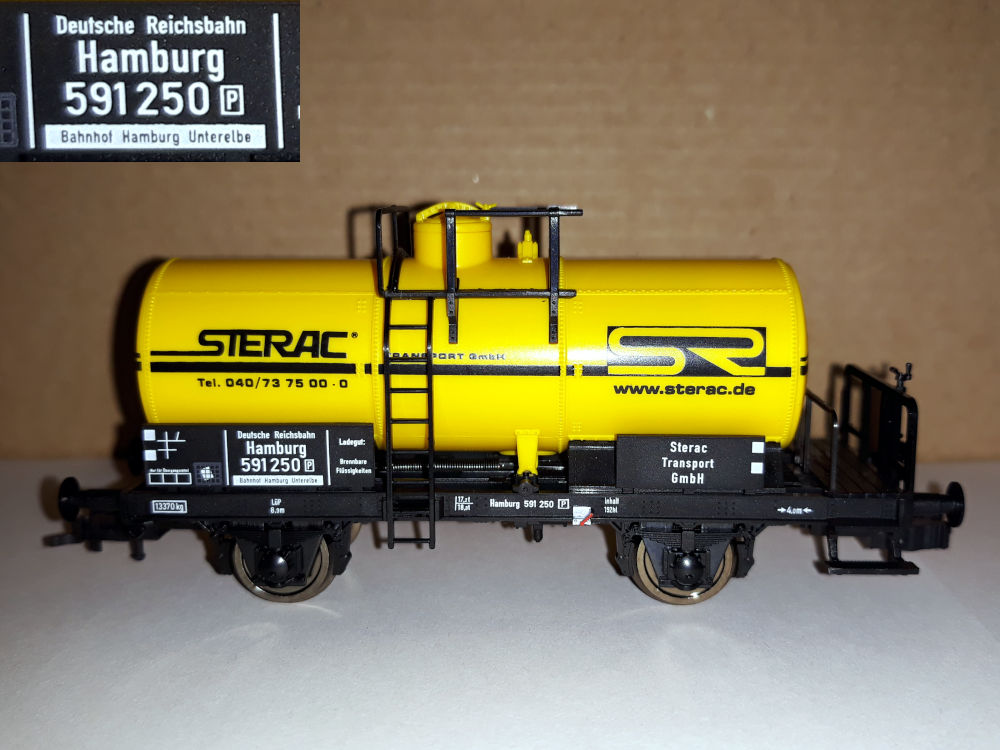 Фотографий "канарейки" в Интернет полно. Первая известная модель была выпущена TRIX к Нюрнбергской выставке в 2013 году в масштабе N, по сути, это сувенир, а не модель, хотя имеет номер Minitrix 15700, так что требования, как к модели, к ней предъявлять нет смысла. Но... модель имеет все атрибуты гамбургской цистерны, кроме того, что она сделана с совершенно другого прототипа. Что интересно, у сувенира-модели сохранен номер прототипа: 591 250. При этом Marklin, выпуская несколькими годами ранее Donnerbuchse в окраске Rheingold поставило на модель номер, которого заведомо не было в составе Rheingold никогда (на 1 больше, чем диапазон номеров в действительности). В данном случае такого не сделали. Модель очень качественная и эффектная (несколько фото прилагаю, более качественные фотографии, думаю, можно легко найти, если целью задаться). Воспроизведены, ко всему прочему, потерянные у "прототипа" держатели сигналов... Стоит сказать, что прототип, которому соответствует облик (не окраска, а форма) модели, представляет интересную клепаную цистерну для химии ("канарейка" из Гамбурга - явно для легких нефтепродуктов в оригинале), и, кроме Trix, моделей такой цистерны не попадалось.
