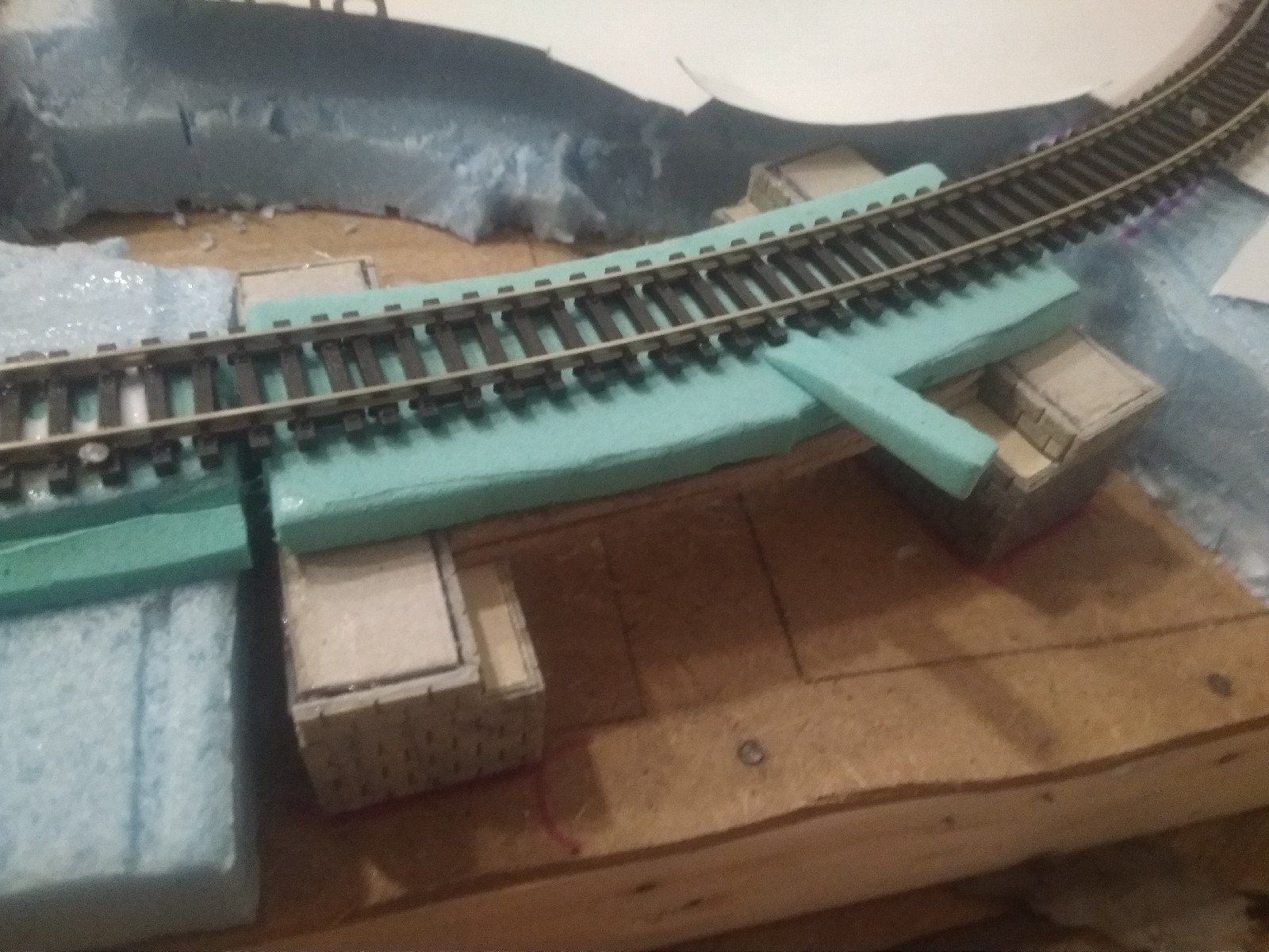 Я робив так - спочатку роздрукував схему макету в масштабі 1:1, потім повирізуав ножицями потрібні ланки і використовував їх як шаблон щоби гнути флекс. Рухомий склад перед проклейкою теж проганяв. Радіус за мостом правда вийшов меншим, аніж планував (але в межах норми) - я не врахував що контррельси виходять за межі мосту і тому щоби їх торці не сильно змішались відносно осі в кривій, додав прямої на 4 шпали з кожного боку. Проводи паяв до з'єднувачів знизу.