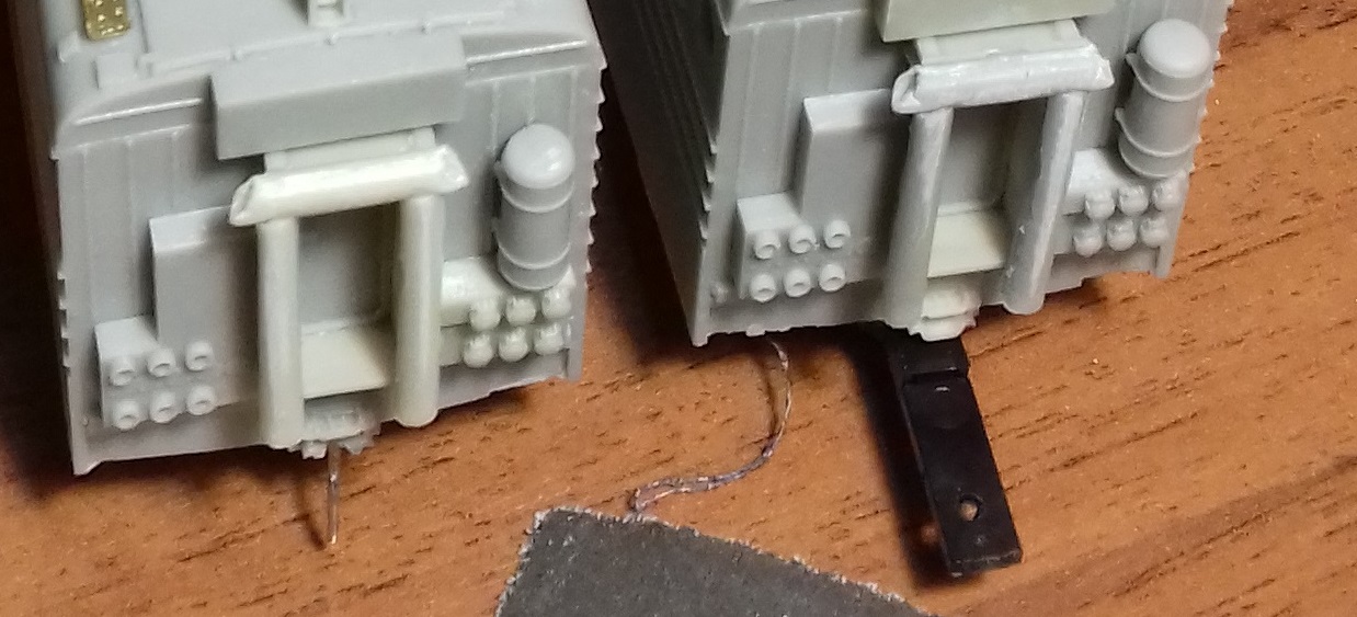 Чтобы выверить расстояние между секциями, приклеил основные элементы на задние части кузовов. Сцеп между секциями в итоге сделал жесткий. У "каталки" в штатное место СА3 - проволка, у моторной - дышло в НЕМ-шахту.