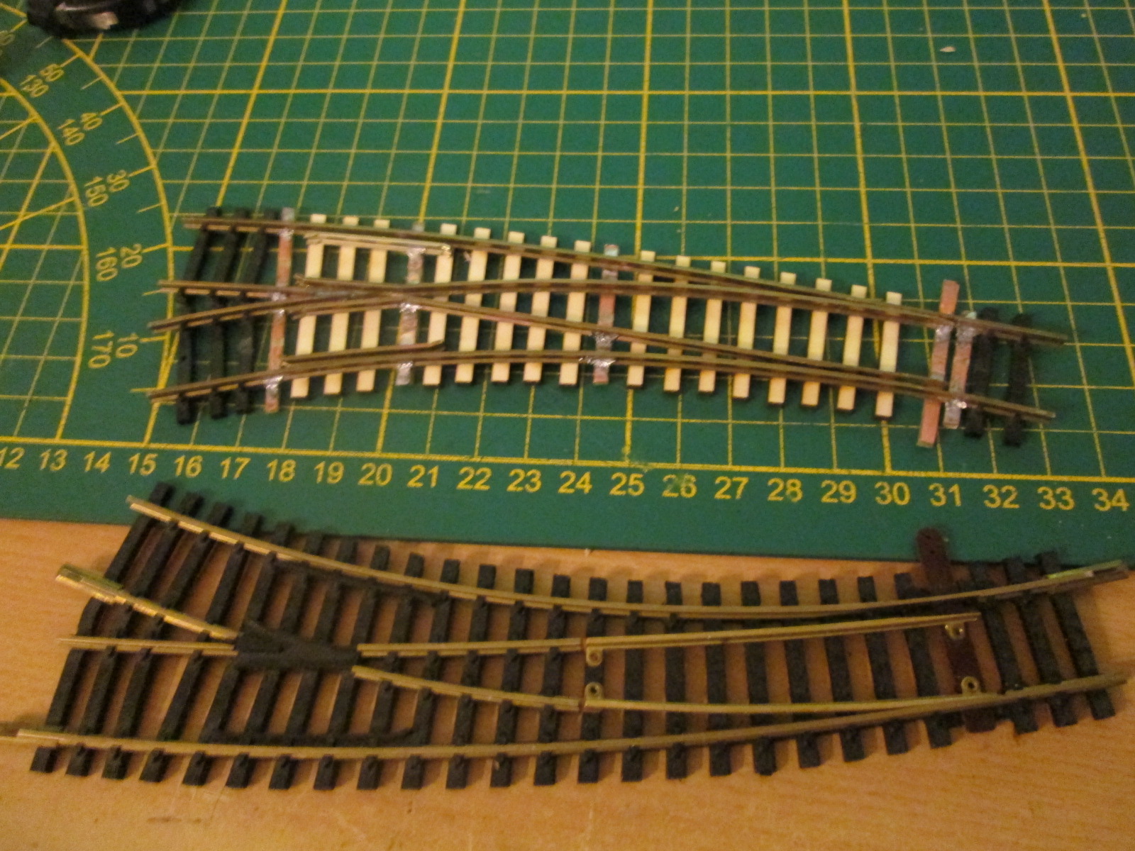 потом да попробовал загнуть усы в контр рельсы за цело, формируя крестовину всю из металла, чуть хлопотнее в выставлении на ш.р., но посильно.