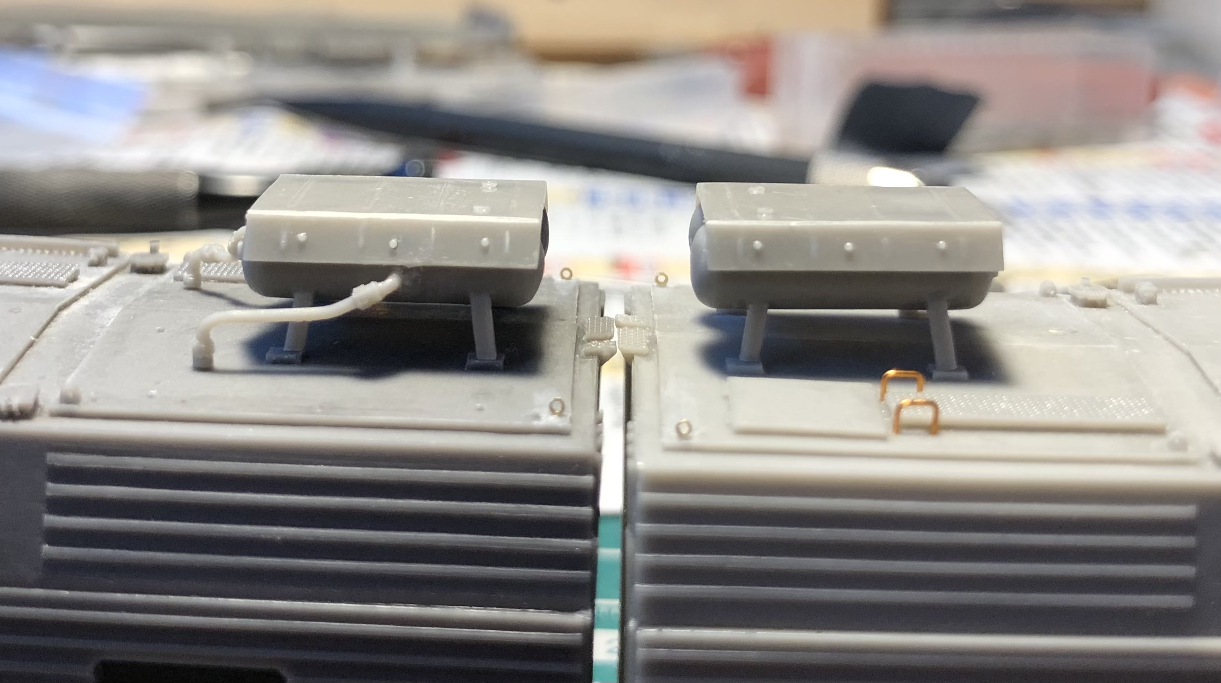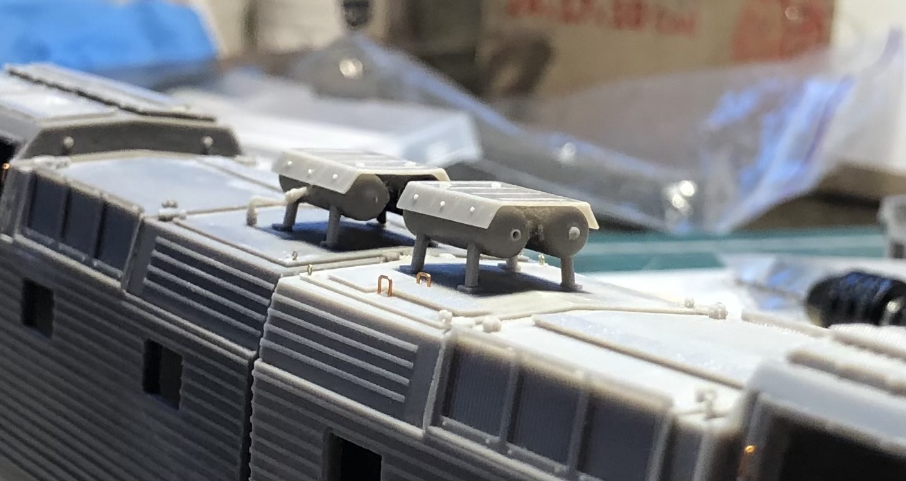 Так же на обоих кузовах просверлены все отверстия, кроме БФ и прожекторов, жду сверла нужного диаметра. Некоторые поручни были сразу вклеены.., поручни в кабины просто примерены, что бы посмотреть правильно ли просверлил отверстия..