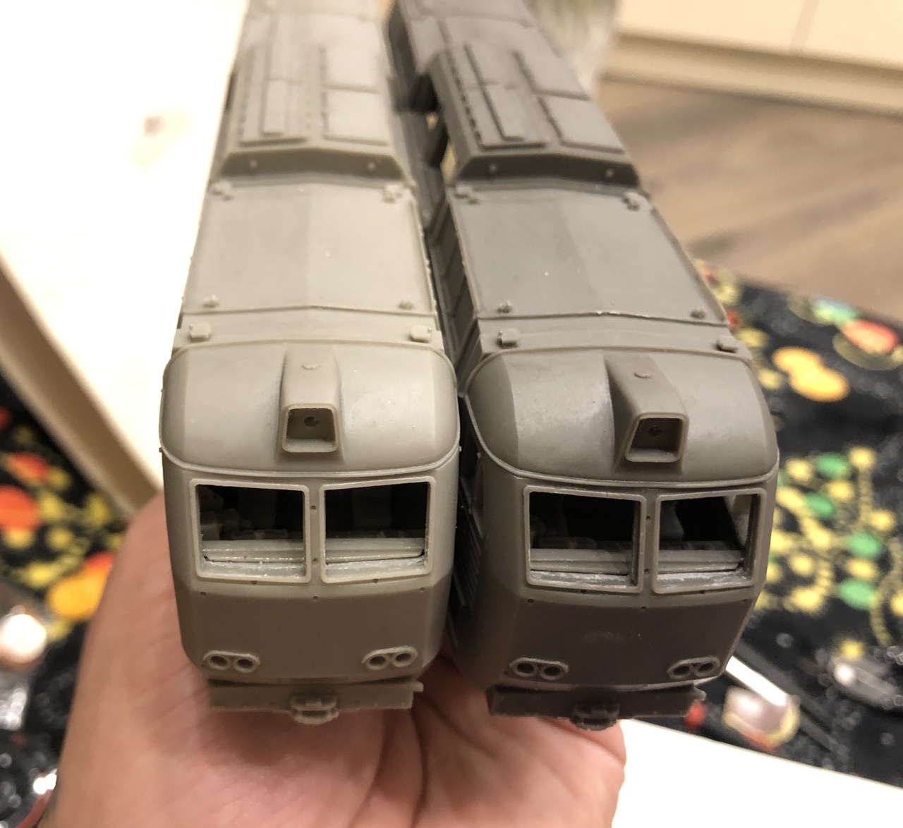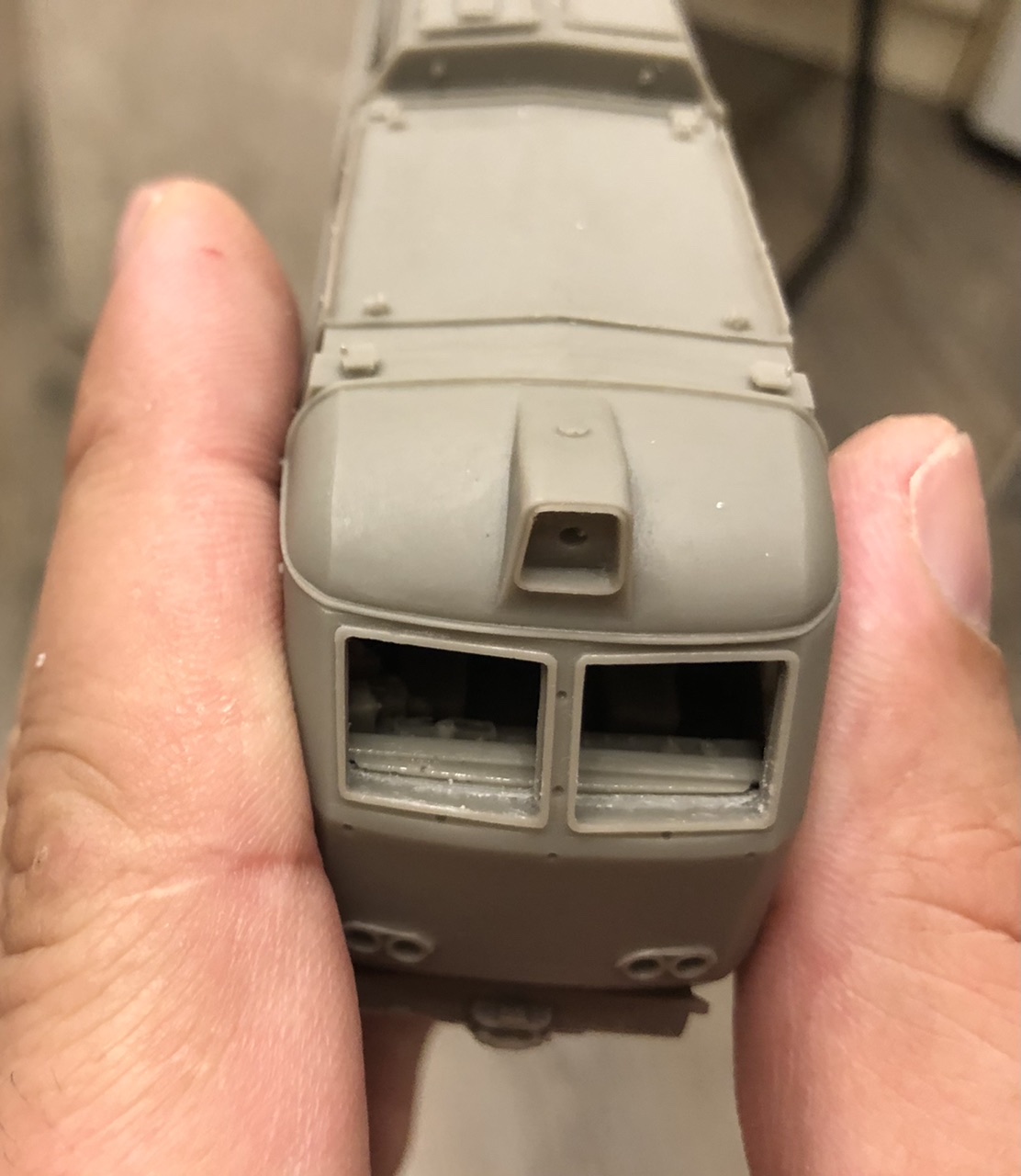 Так же на обоих кузовах просверлены все отверстия, кроме БФ и прожекторов, жду сверла нужного диаметра. Некоторые поручни были сразу вклеены.., поручни в кабины просто примерены, что бы посмотреть правильно ли просверлил отверстия..