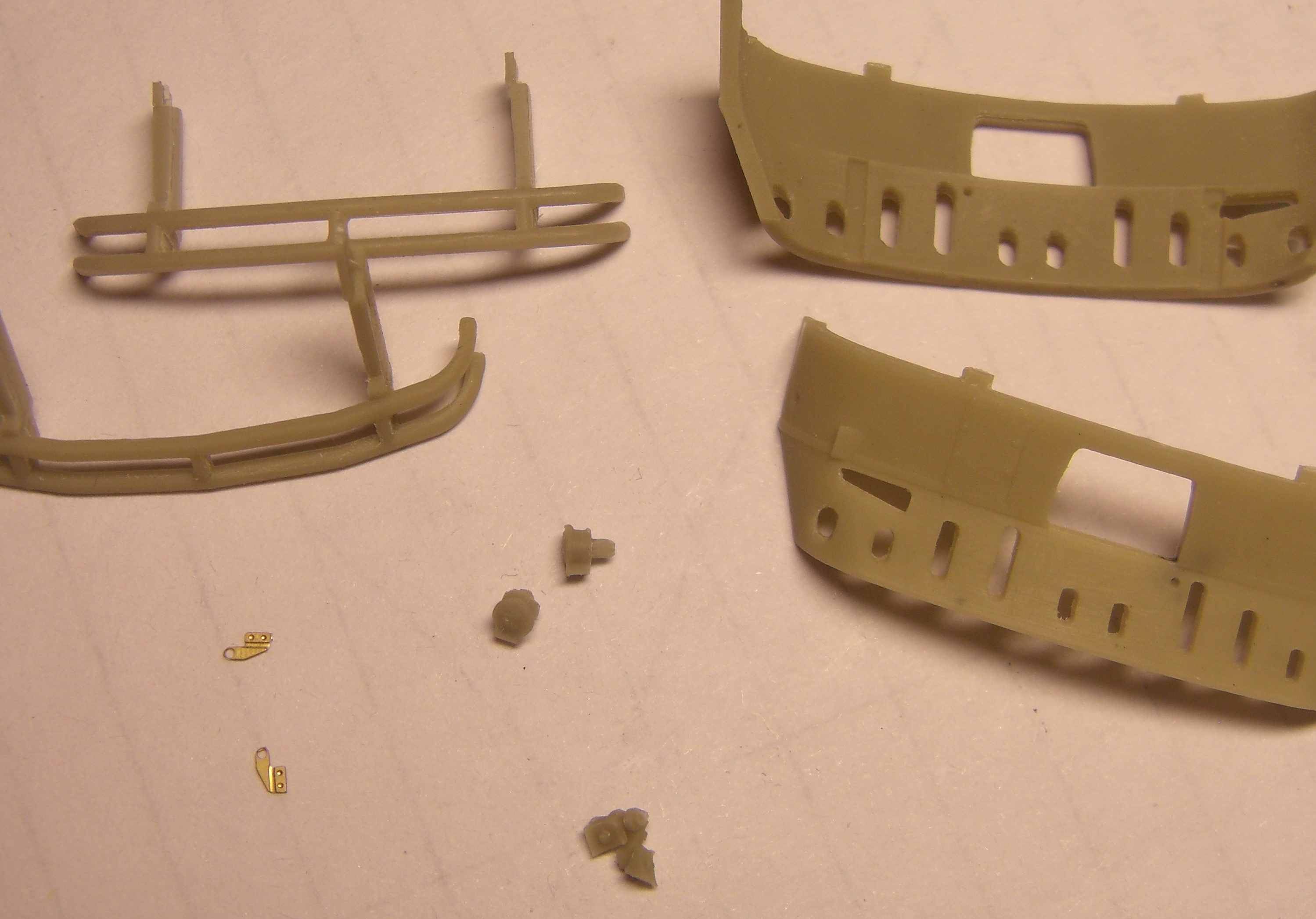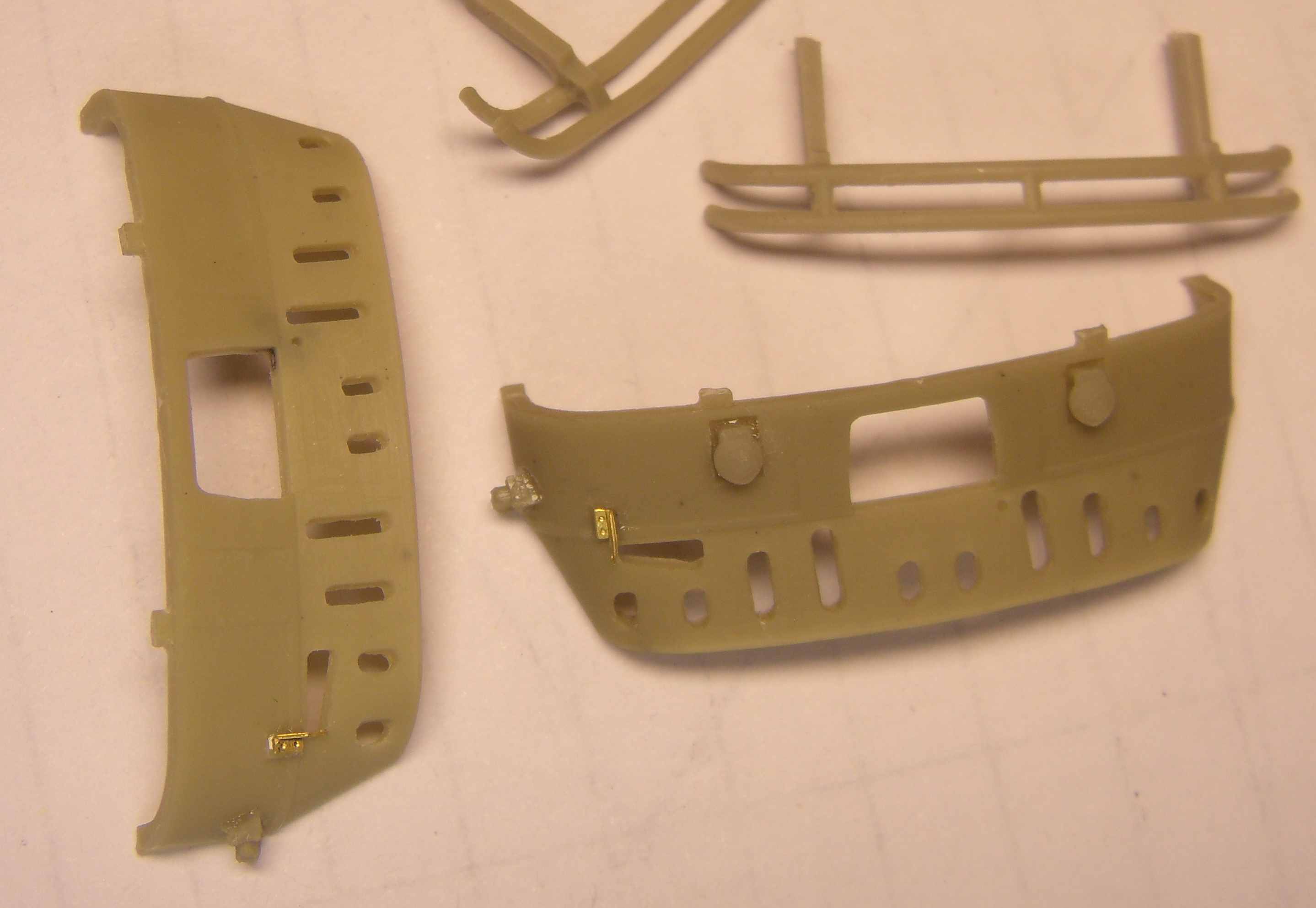 Потом добрался до детальки с тормозными колодками и тягами. Примеряя её на своё штатное место, стало ясно, что в ходовом варианте её установить не удастся, мешает токосъём, да и слишком близко колодки к колёсам получаются, они просто обломаются. Но вид внешний с тягами, существенно улучшается, поэтому мне захотелось их как то всё же установить..., я обточил их, откусил "лишнее", и приклеил примерно на свои места.... вышло вот так...