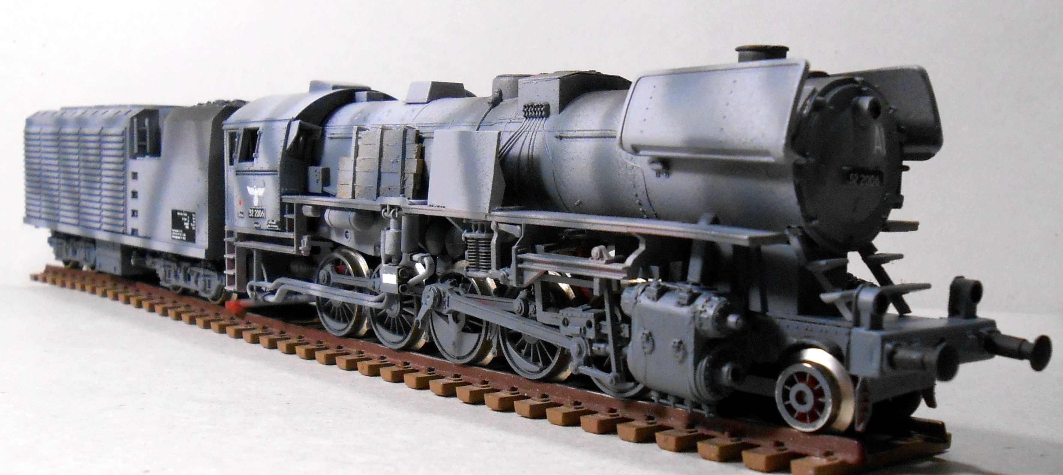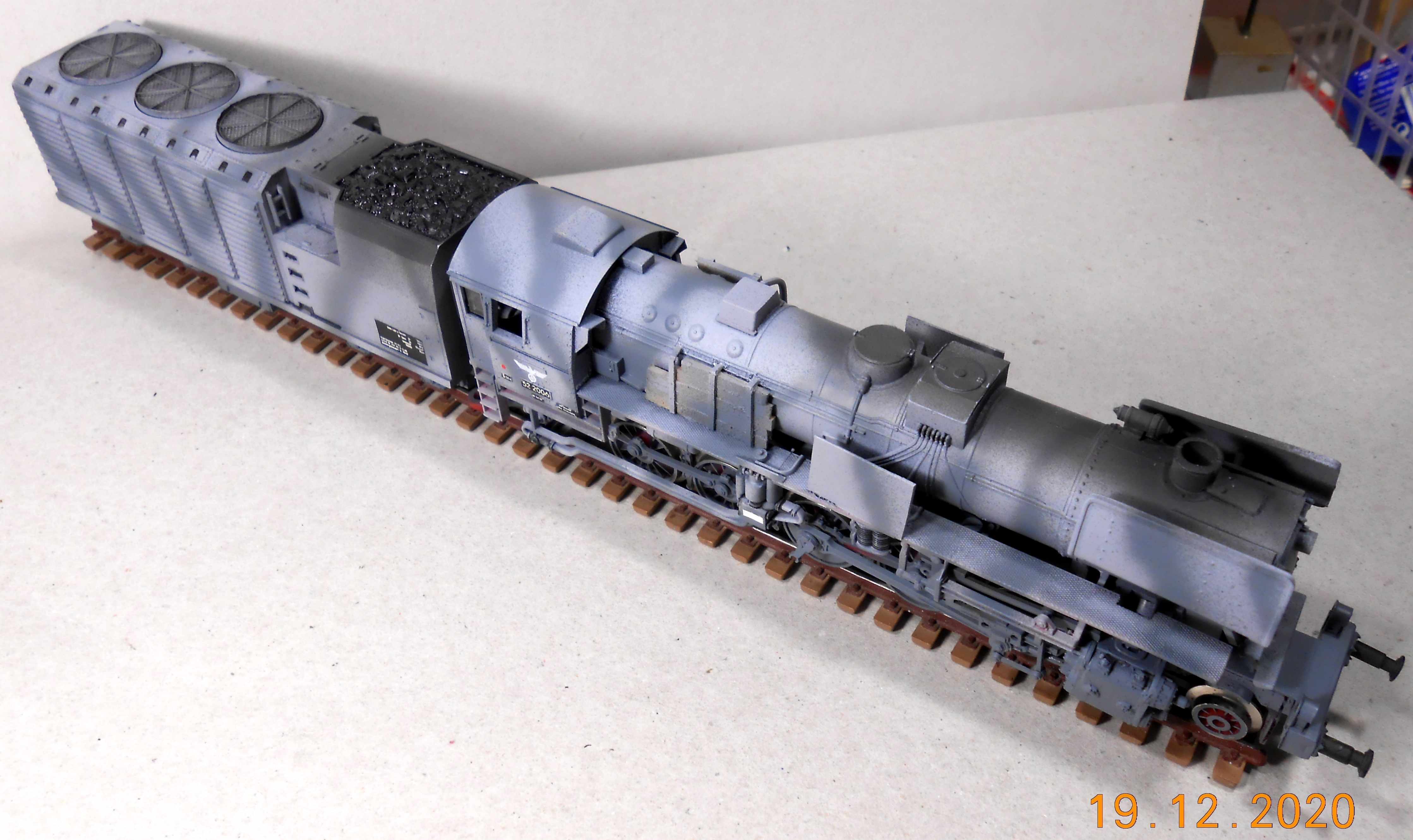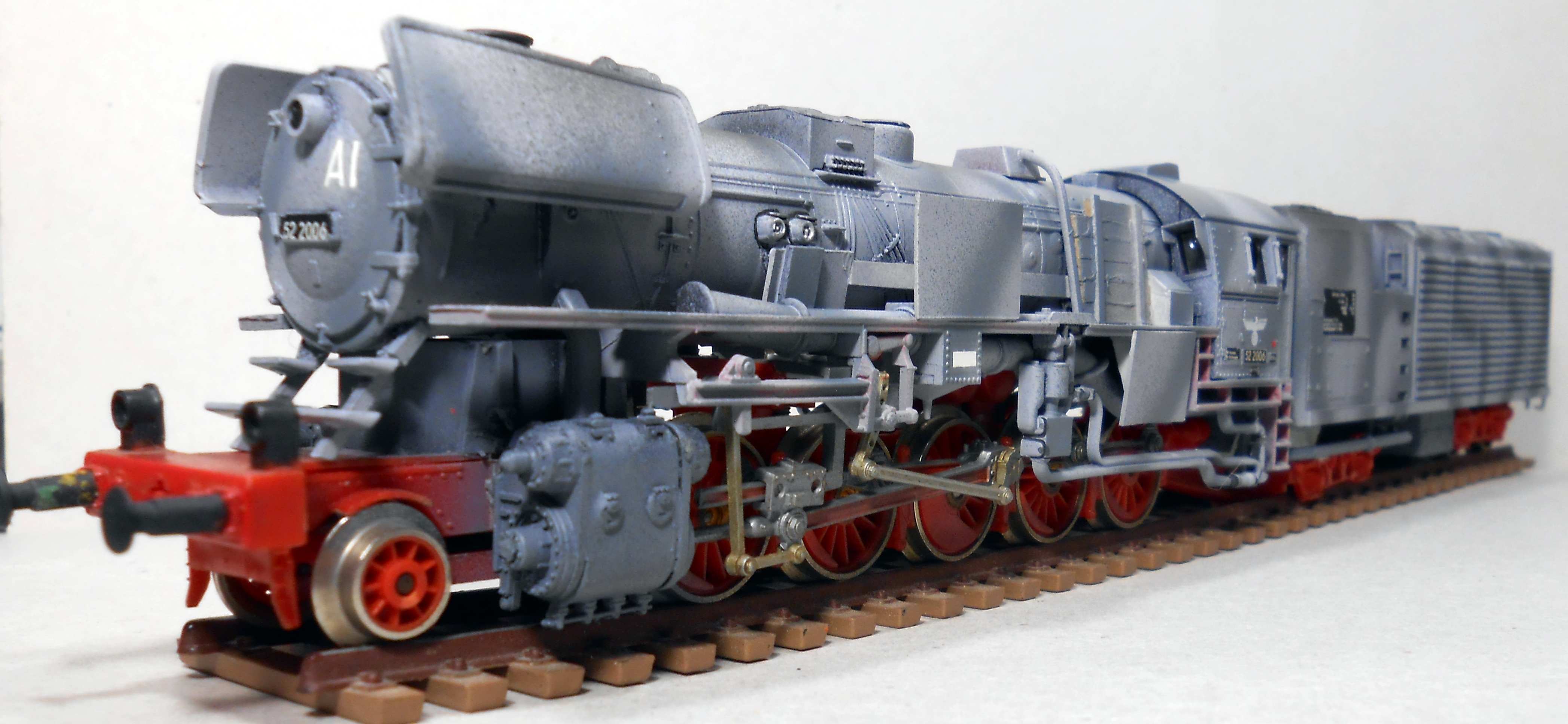 Дионисий, отлично получилось! Но, если брать паровоз, то 52-ой надо было целиком в военную серую окраску красить, а уже потом на него наносить камуфляж. Все 52-е с заводов выходили в серой военной окраске, и уже по окончании войны их начали окрашивать в стандартные цвета. То есть никаких красный частей на нем в период войны не было - поэтому ходовые части стоит тоже докрасить в серый..
