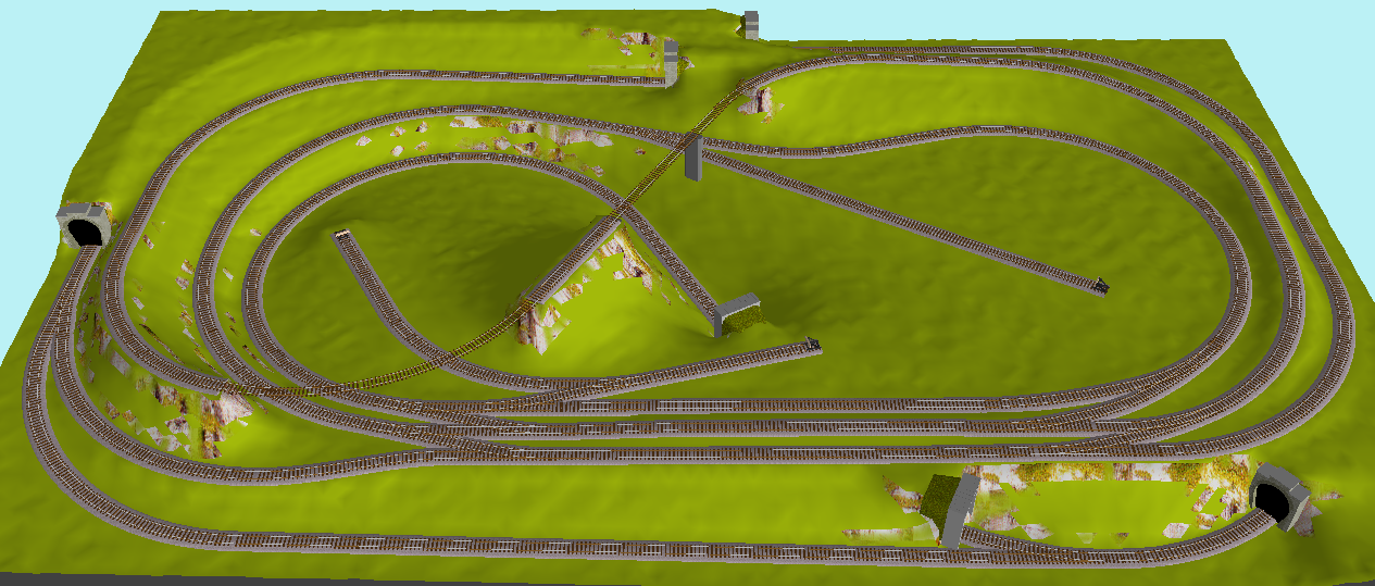 это туннель от китайского набора ж/д, от него так же маленький вокзал на втором ярусе, знаки, шлагбаумы и некоторые елки. Авторами дизайна он был поставлен, как ангар-депо на первом ярусе, но я, пользуясь сном дизайнеров, поставил его там, что б лучше было видно ПС на запасных путях. Я планирую на 2-м ярусе высадить лес, но это уже после того, как по человечески оформятся туннели и подъемы.