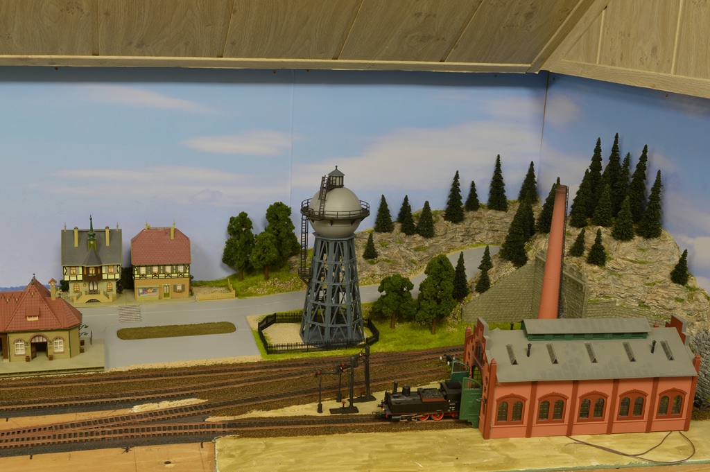 Этот участок макета я называю "старым городом", поскольку здесь собраны домики, которые я клеил еще школьником (страшно сказать!) около 45 - 50 лет тому назад. Это еще VERO. Для полноценного города добавил чуть более новые станцию, депо, лесопилку и водонапорную башню. Им примерно лет по 25...