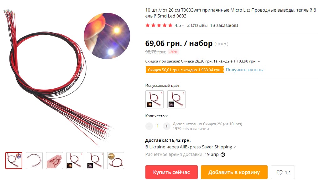 Для прожектора и буферных фонарей паровоза Тк приобретены светодиоды с припаянными проводами.
