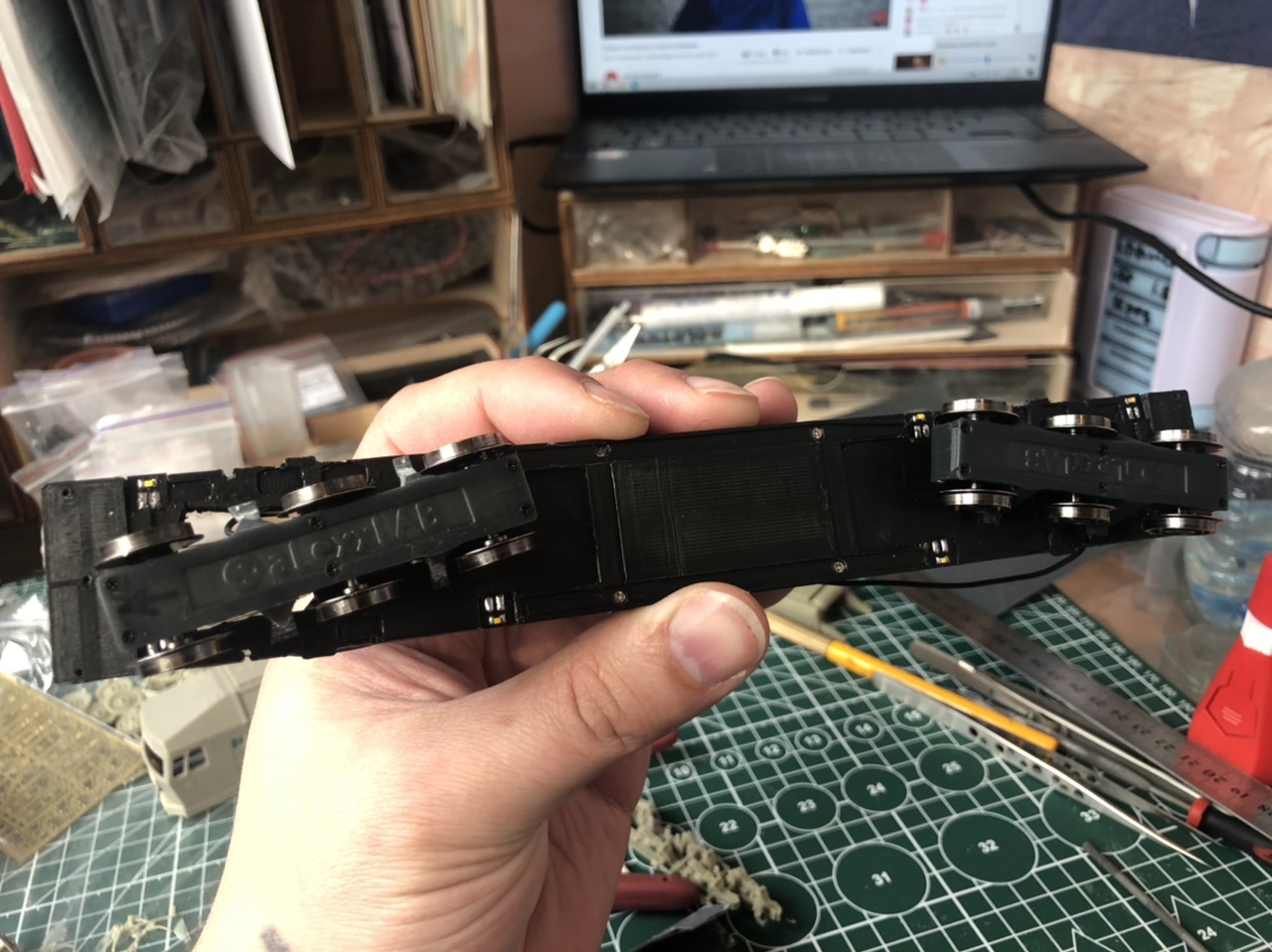 Кит, как и все до этого, собранные мной, отлит из смолы от фирмы БуДем (Илья Бушнев https://youtube.com/user/avtobush). Обмоторку и отцифровку так же делал Илья. Звуковой декодер стоит от Моделдепо (http://www.modelldepo.ru ), кстати, Илья прислал мне белорусские звуки, нужно разобраться с программатором и перезалить их.