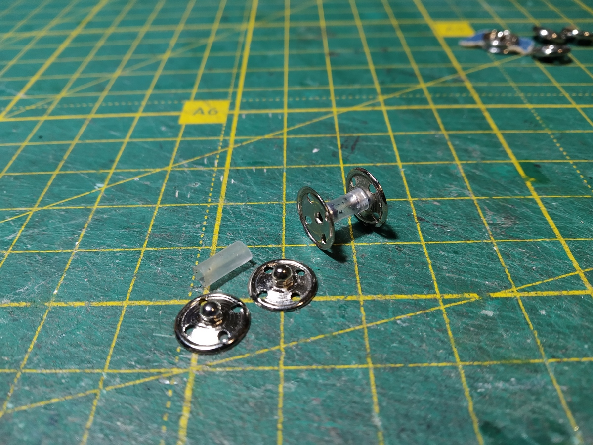 Для модели применены одёжные кнопки диаметром 9 мм и отрезки от классического тонкого стержня шариковой ручки. Можно использовать обе половинки. Только надо извлечь распорные пружинки.