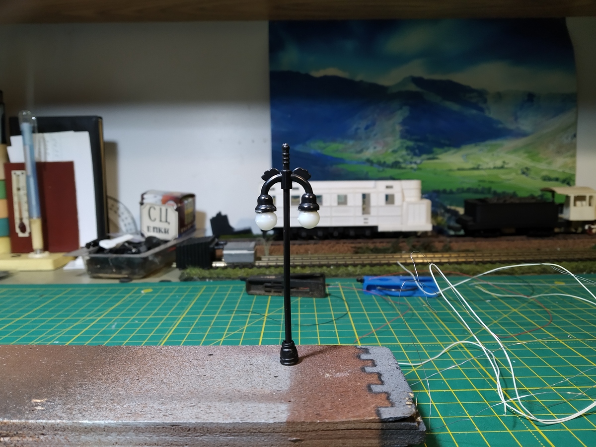 При 70 мм общей высоты плафоны находились на высоте 45 мм от основания. Довёл эту высоту до 60 мм, общая стала 85. Немного изменил форму кронштейнов - нагрел над жалом паяльника и отогнул. В общем, если смотреть с метра, а не изучать в макро, то можно перетерпеть до лучшего варианта. Но холодный белый спектр в моём случае вообще исключает установку этих фонарей на макет.