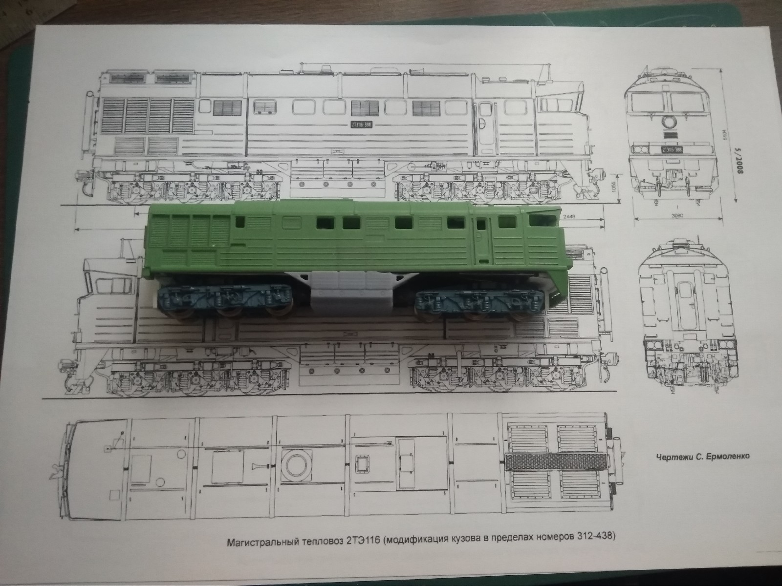 Глибока конверсія 130-го від БТТБ у 2ТЕ116. Поки лише перепил рами та примірка. Кузов та бак робив не я, матеріал - фотополімер. Кузов чорновий, у зеленому грунті.