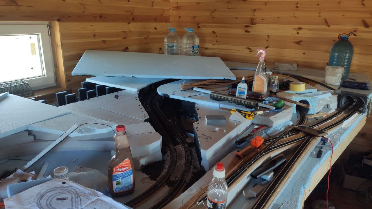Так, проблема була у фанері, а точніше у її довжині. Якщо б довжина фанери була велика, можна було її вигинати, щоб забрати гострі кути. При використанні пінопласту із запасом висоти, його сточував шліф-шкуркою та робив ухил до центру радіусу, що додавало реалістичності при проходженні повороту. Також фанеру треба лобзіком різати, важко обробляти. А найголовніше - це жахливий резонанс, шум (пустота з низу підсилює шум), коли потяг їде. Пінопласту має теж мінус - це пил, який утворився при обробці, постійно треба пил забирати.railmodel писав: