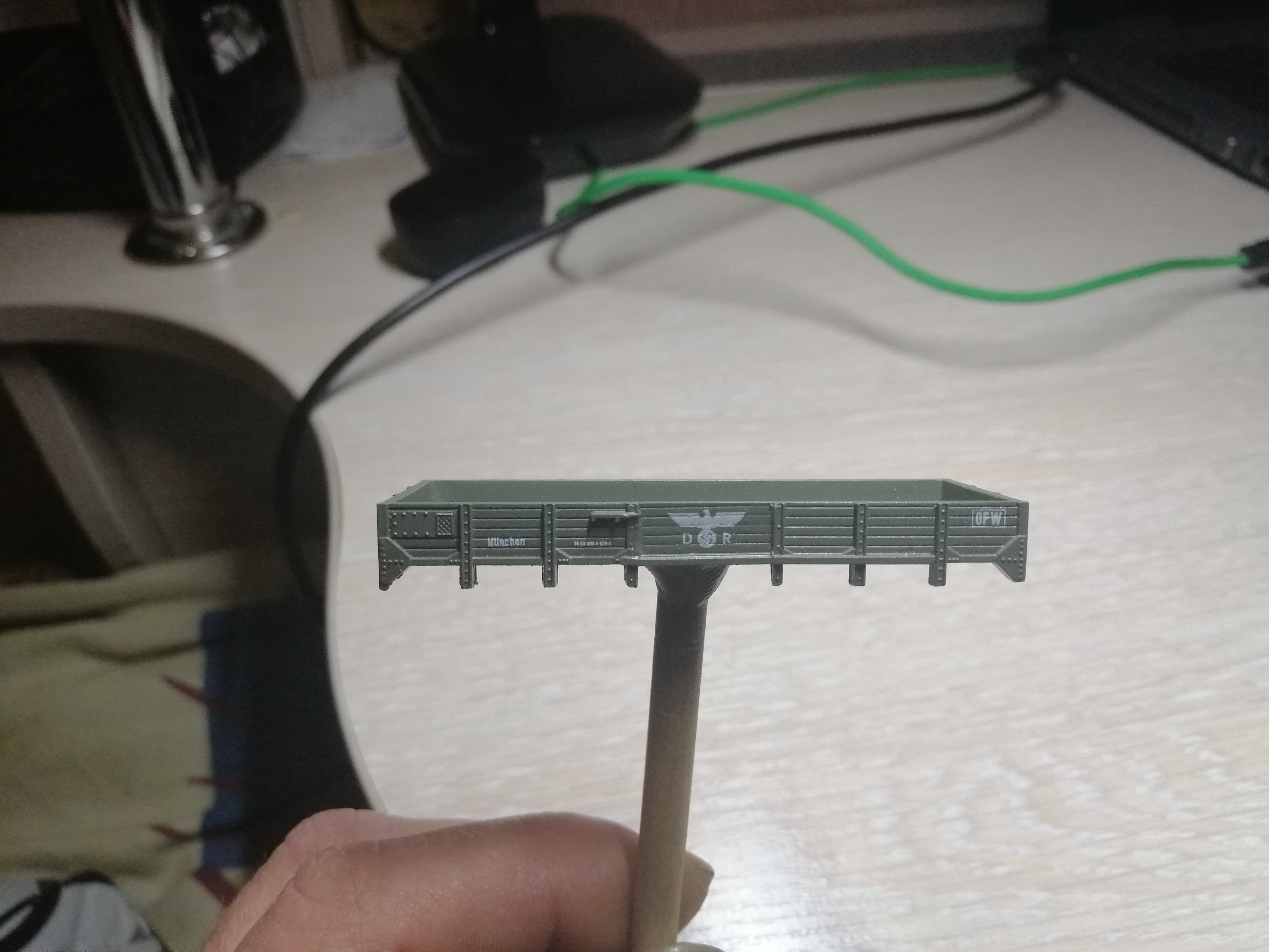 Ще один вечір пройшов в запилі першого вагона- платформи. Щойно закінчив покраску й обдекалив. Буде десь так завра підберу ходовочку і перший із вагонів для поїзда буде готовий.