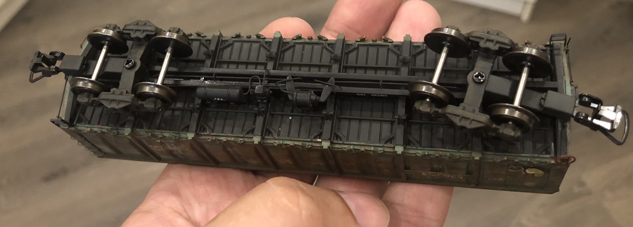 Пофоткал снизу тапок.., пришлось не только метельники сдвигать но и коробку сцепки подтачивать.., но вот эти выступающие деталюшки снизу так же лучше подточить до минимума, но так что б они не сломались.., как я уже писал, у телег ход будет больше. Но тогда и пружины придется вообще не клеить, потому что они будут упираться в кузов.. или смещать их к внутренней стороне рамы телеги..