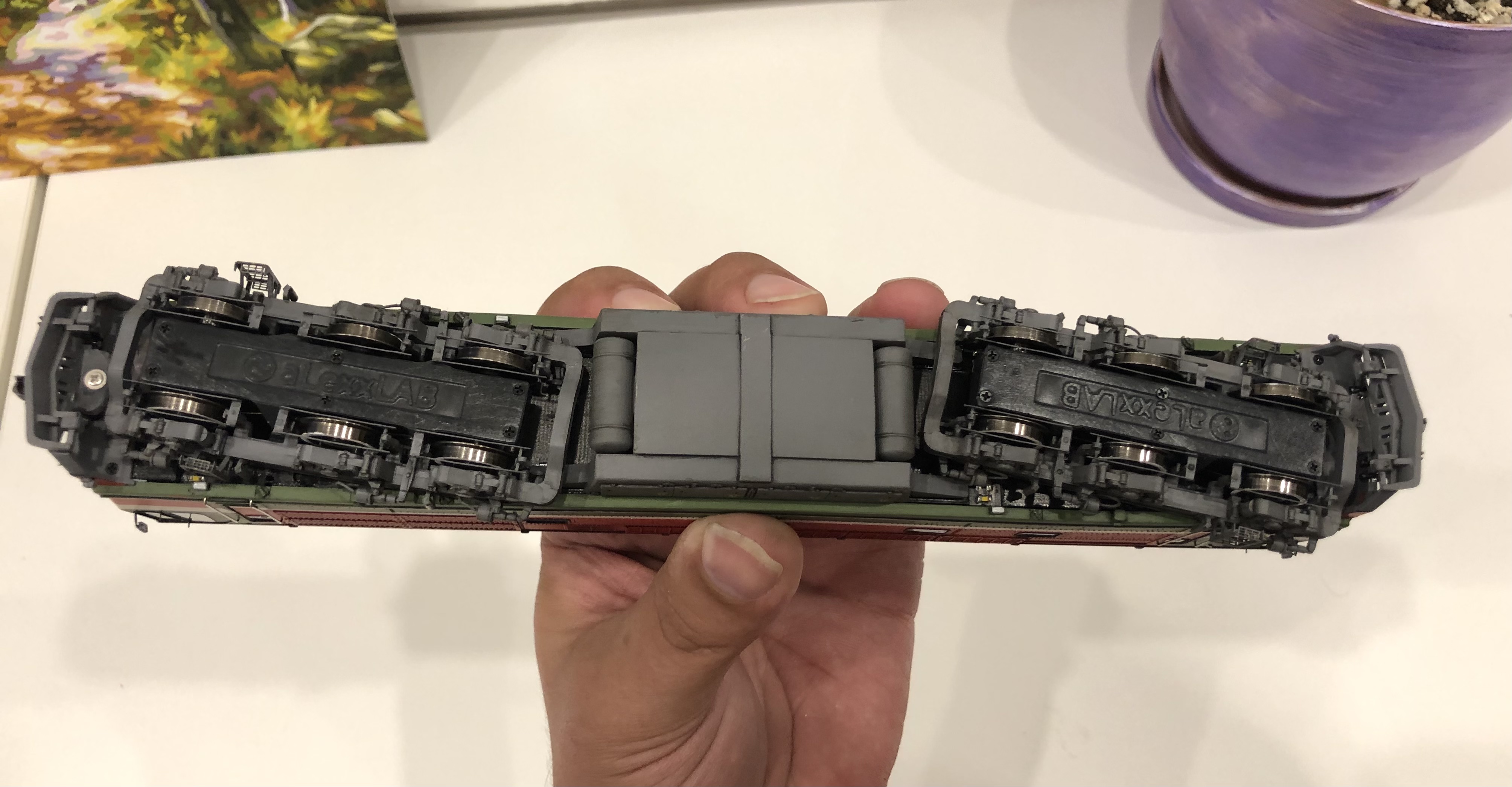 Итак, тележки. Тут товарищи недавно делали заказ запчастей на Роко, ну и я заодно заказал две тележки - пустышки (корпус, крышка и поддон) от нового Е103 (семидесятитысячные артикулы). Сегодня мне товарищ продал две тележки от "среднего" е103, то есть от шестидесятитысячных артикулов. Ранние тележки, то есть сорокотысячняки, идентичны 60 000, но только до крайней оси не довели шестерни.