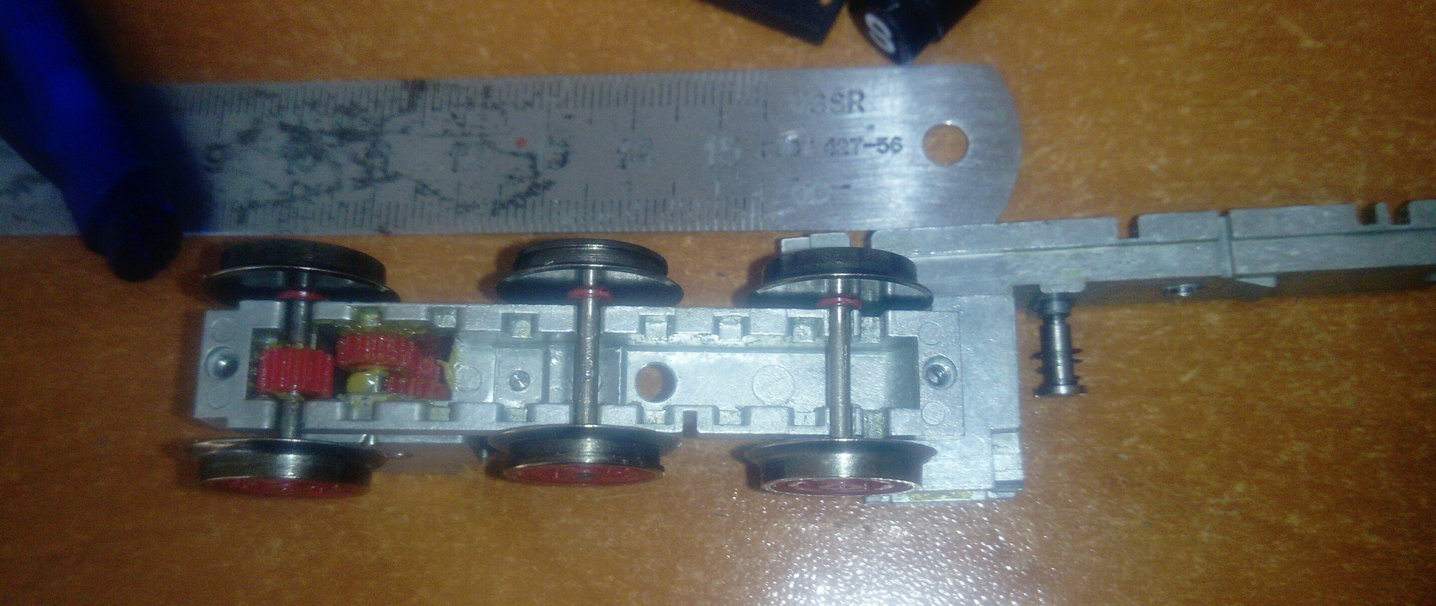 И сейчас сравнивая 70 000 и 60 000 становится понятно, что 60 000 предпочтительнее по конструкции для ТЭП70, то есть для движения третьей оси в сторону второй. Легче пропил делать, гораздо. Причем тут кумекаю, как и третью ось сделать движущей, и вот что решил. Взял тележку от Нохаба обычного, глянул на ее колпары. Оказалось, что они с теми же шестернями, что и на Е103 (60 000). А так как у Нохаба межосевое 2000-2000, то есть столько же, сколько у ТЭП70 между второй и третьей колпарами, то есть идея воспользоваться промежуточными шестернями от нохабовских телег, а не использовать гораздо большие родные от Е103. Придется только под новые штифты отверстия засверлить поточнее, тогда будет у ТЭП70 роковская телега со всеми тремя ведущими колпарами.