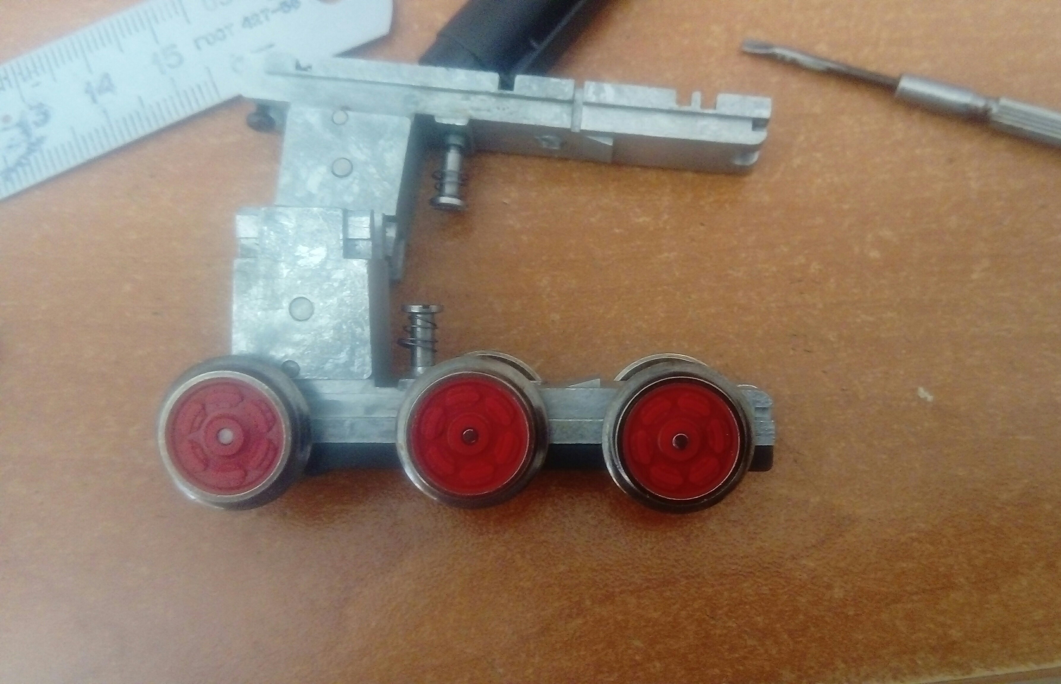 Если с механикой тележки уже что-то вырисовывается, то с ее имитацией придется поработать. Дело в том, что кит то заточен под стенд и вся тормозная рычажка расчитана на копийный стенд, а у нас то модель ходовая с разбегом осей и т.п. Поэтому придется крепления колодок точить, чтобы они ближе к боковинам двинулись, а то или разбега осей не будет, ну или разбегом колодки смоляные снесет)