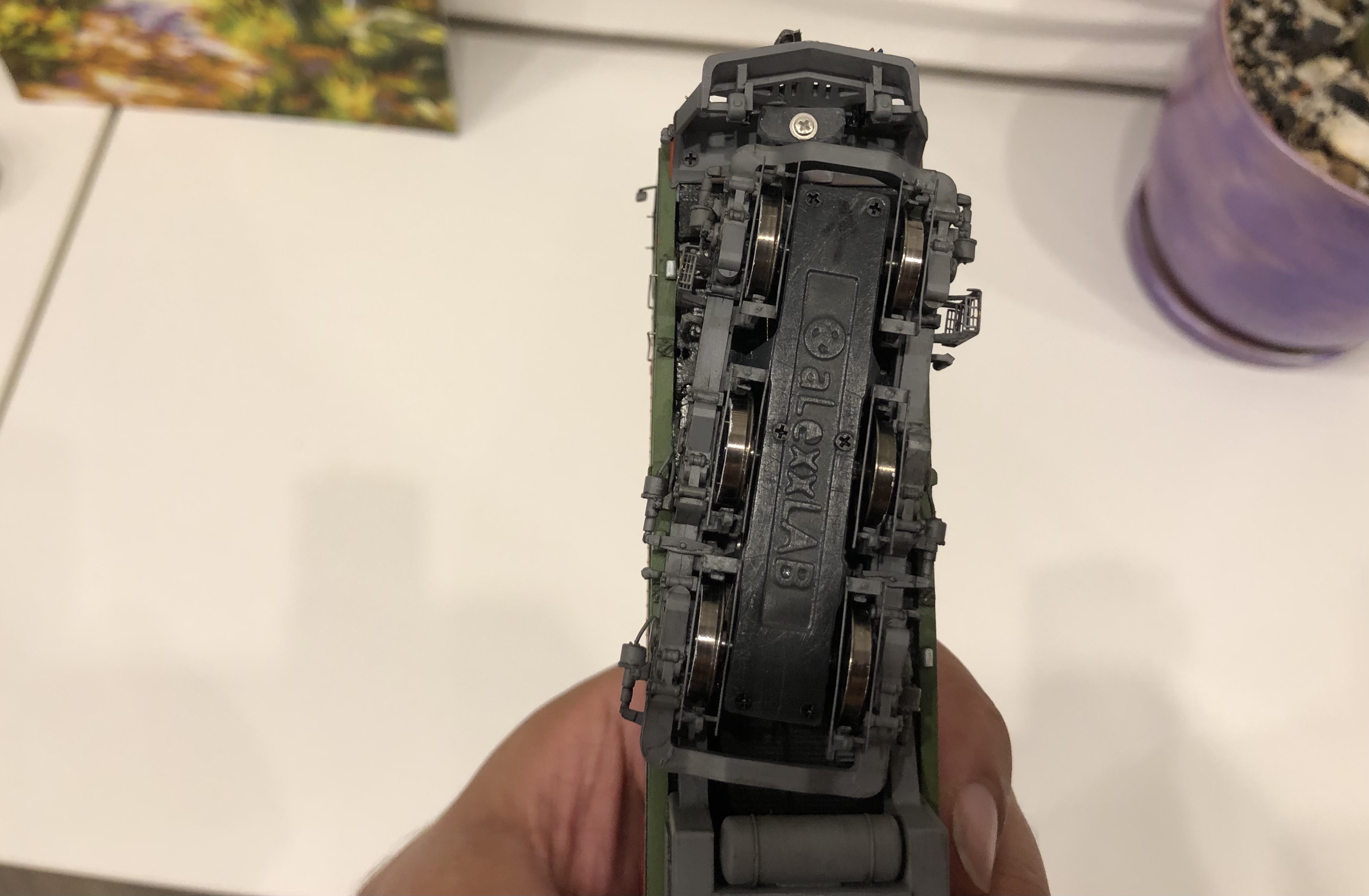 Пофоткал снизу тапок.., пришлось не только метельники сдвигать но и коробку сцепки подтачивать.., но вот эти выступающие деталюшки снизу так же лучше подточить до минимума, но так что б они не сломались.., как я уже писал, у телег ход будет больше. Но тогда и пружины придется вообще не клеить, потому что они будут упираться в кузов.. или смещать их к внутренней стороне рамы телеги..Leonid Popov писав:Степан, спасибо за информацию! А сфоткать снизу свой "тапок" можете? Вы не стачивали немного выступающие части по днищу, которые отдельными детальками в ките идут?