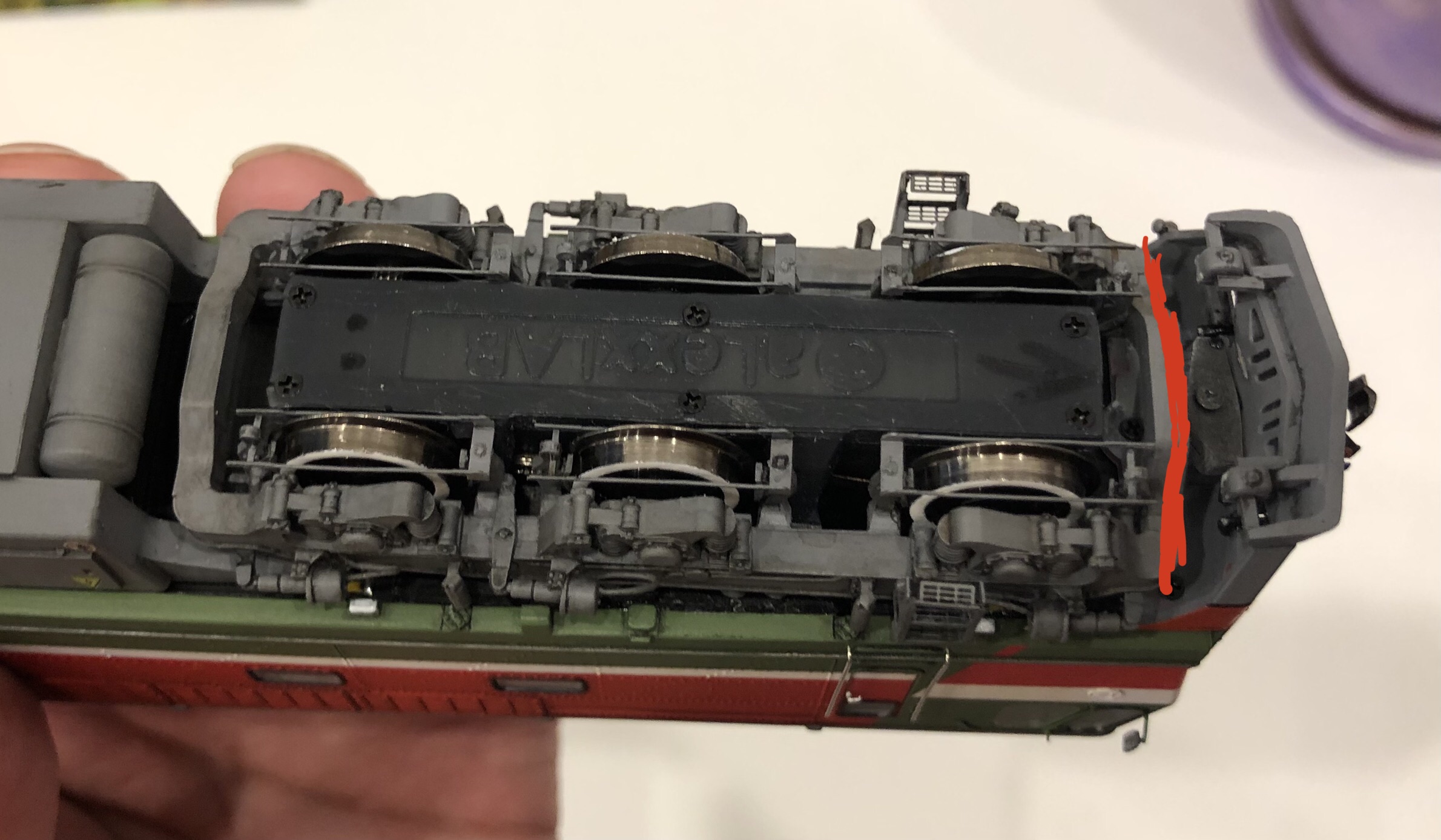 И еще раз уж начал…, может быть, я точно не знаю, но думаю.., если расширить вот эту часть под сцепку, но тоже много не получится.., может быть и с вагоном начнет выруливать в кривой.. но тогда сцепные рукава придется еще больше в стороны смещать..(я и так их смещал, что б ходу сцепки не мешали)prcmoskva писав:Еще вариант вот эту балку подточить.., но это не отменяет подточку выступающих частей на кузове и перенос или вообще не клеить пружины на телеги.. А если точить балку, то сточится кантик который на ней идет.., или вариант точить до сборки ее,, с ее внутренней стороны.. И еще одно но) это касается Сашиной ходовки..prcmoskva писав: Пофоткал снизу тапок.., пришлось не только метельники сдвигать но и коробку сцепки подтачивать.., но вот эти выступающие деталюшки снизу так же лучше подточить до минимума, но так что б они не сломались.., как я уже писал, у телег ход будет больше. Но тогда и пружины придется вообще не клеить, потому что они будут упираться в кузов.. или смещать их к внутренней стороне рамы телеги..
