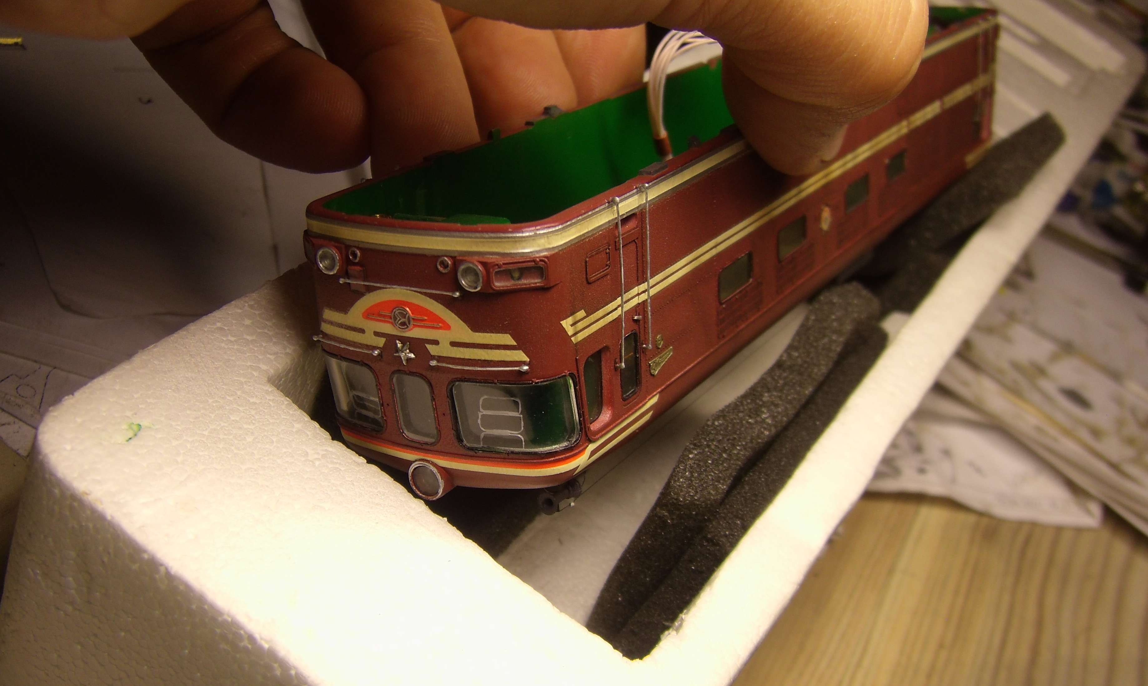 Когда уже сделана антенна, кузов уже не положишь просто так на крышу, и что бы комфортно работать дальше с моделью, пришлось делать специальный бокс с поролоном именно под этот кузов, очень удобно получилось..