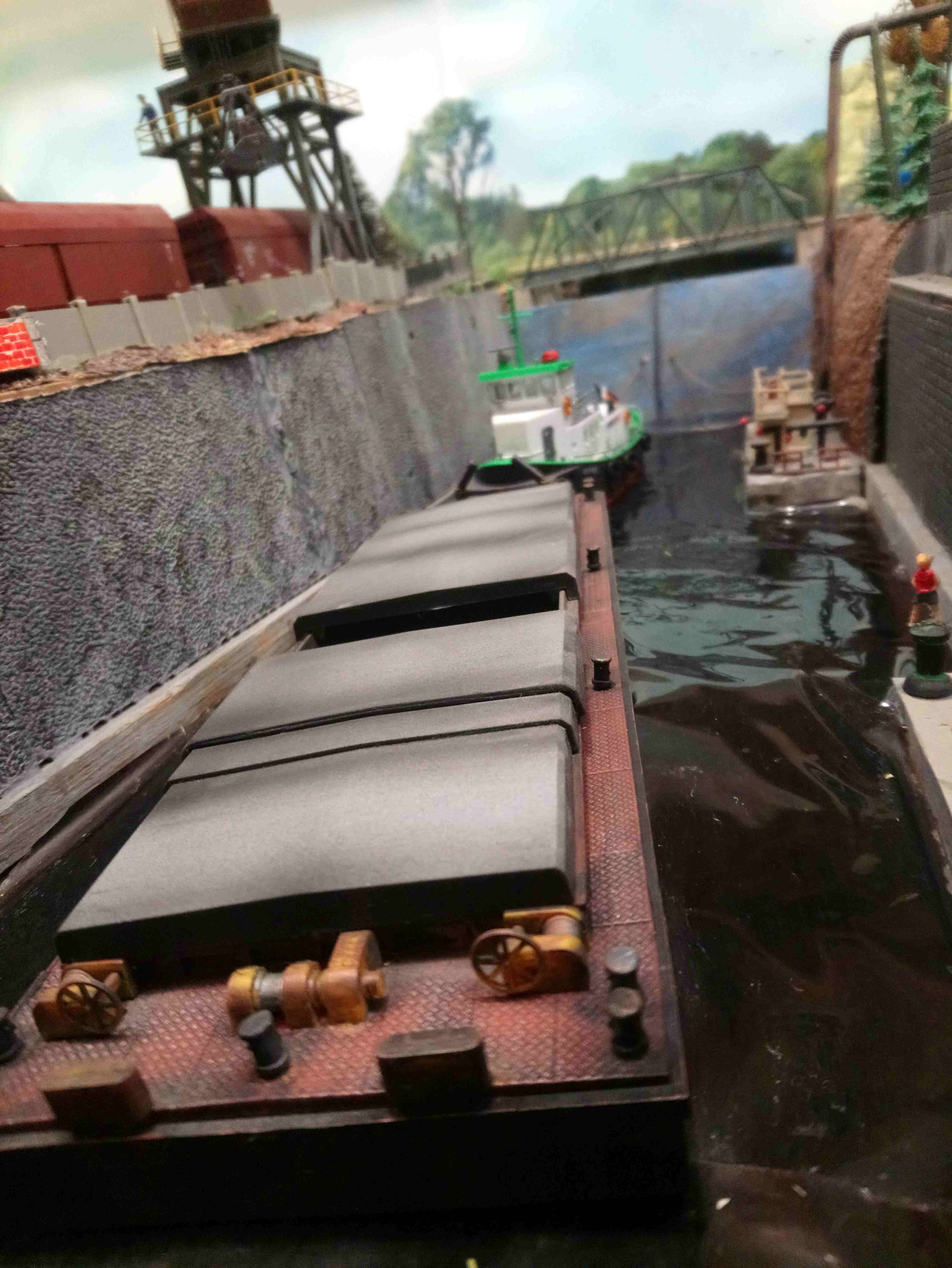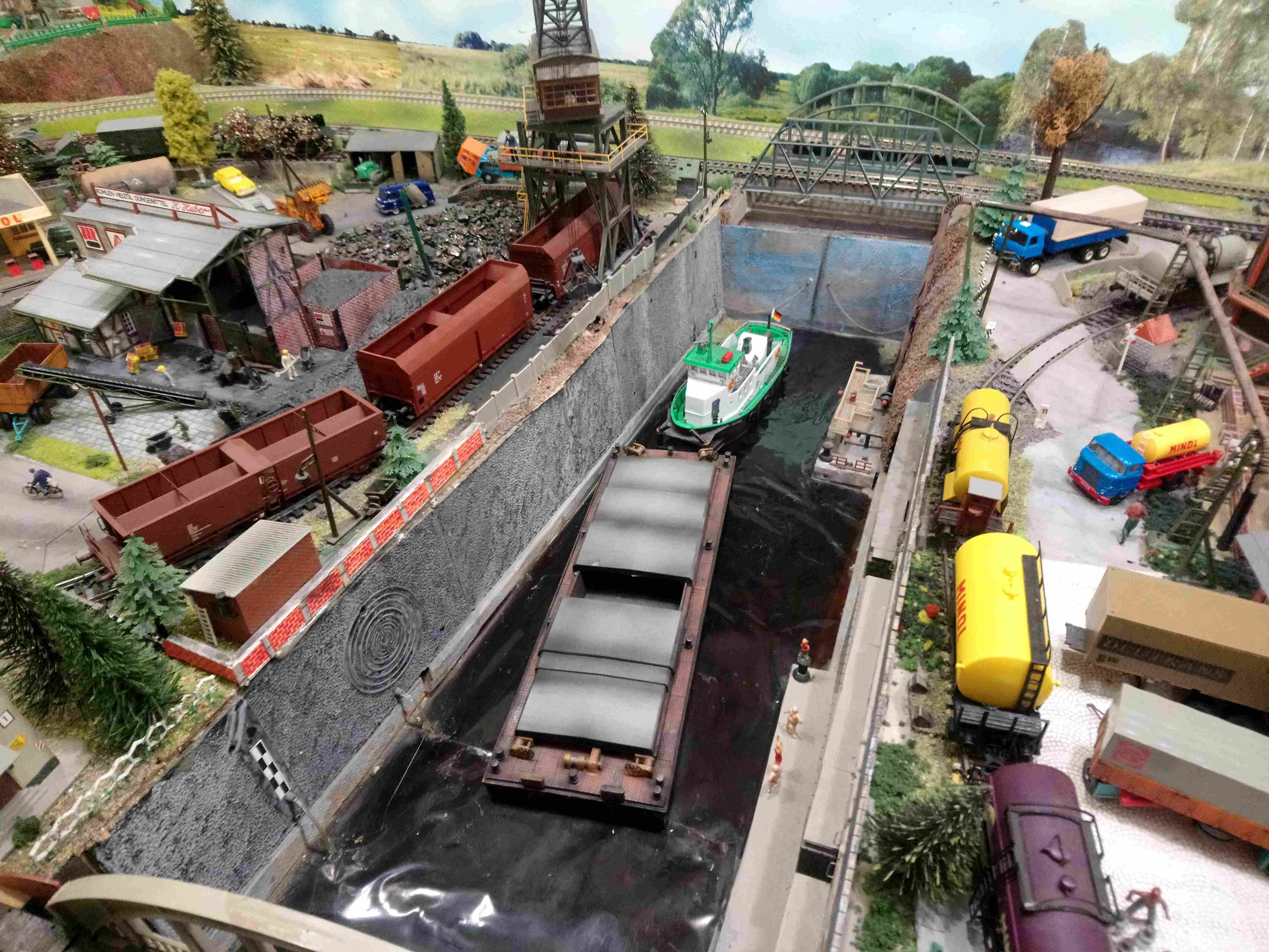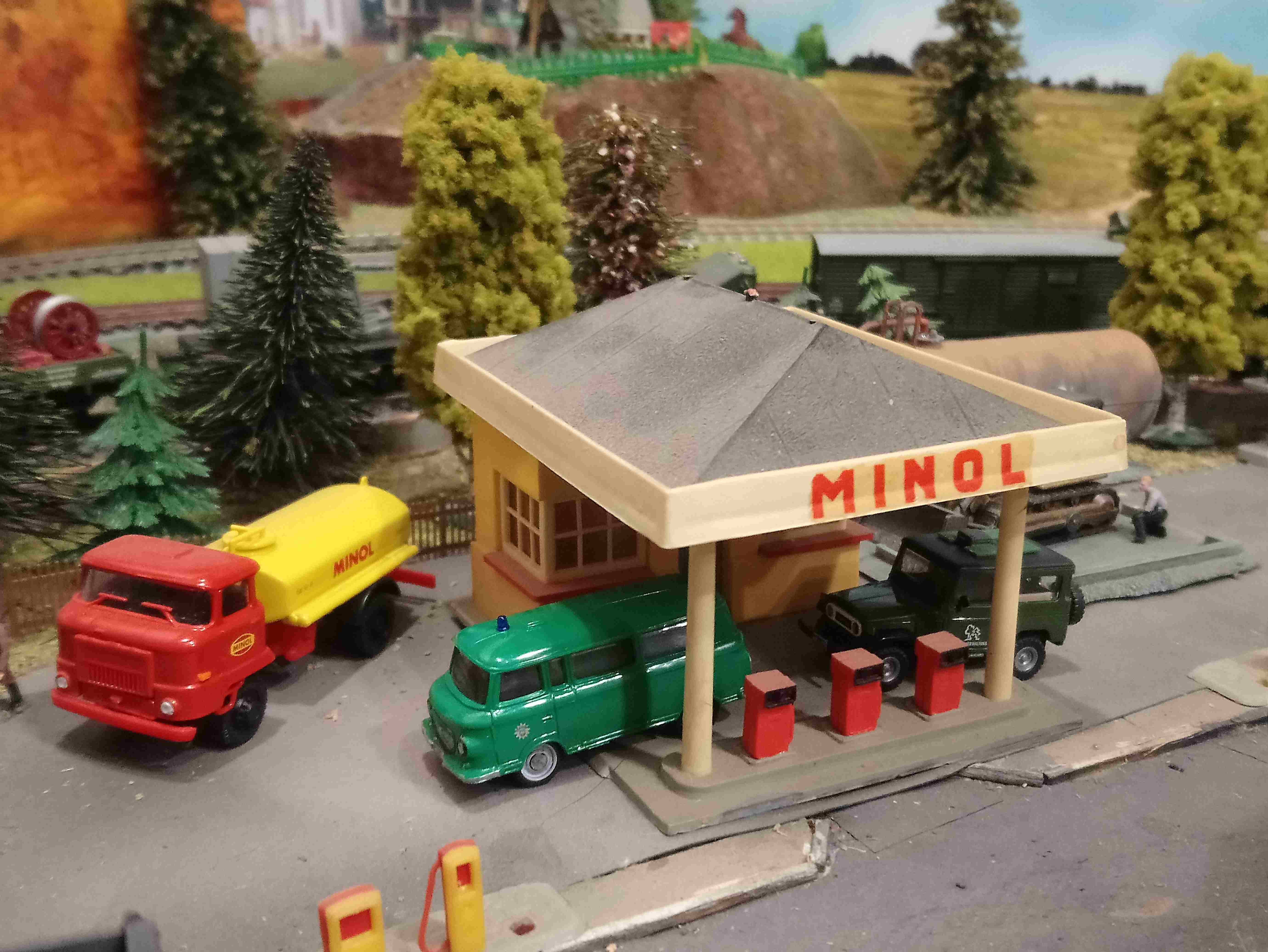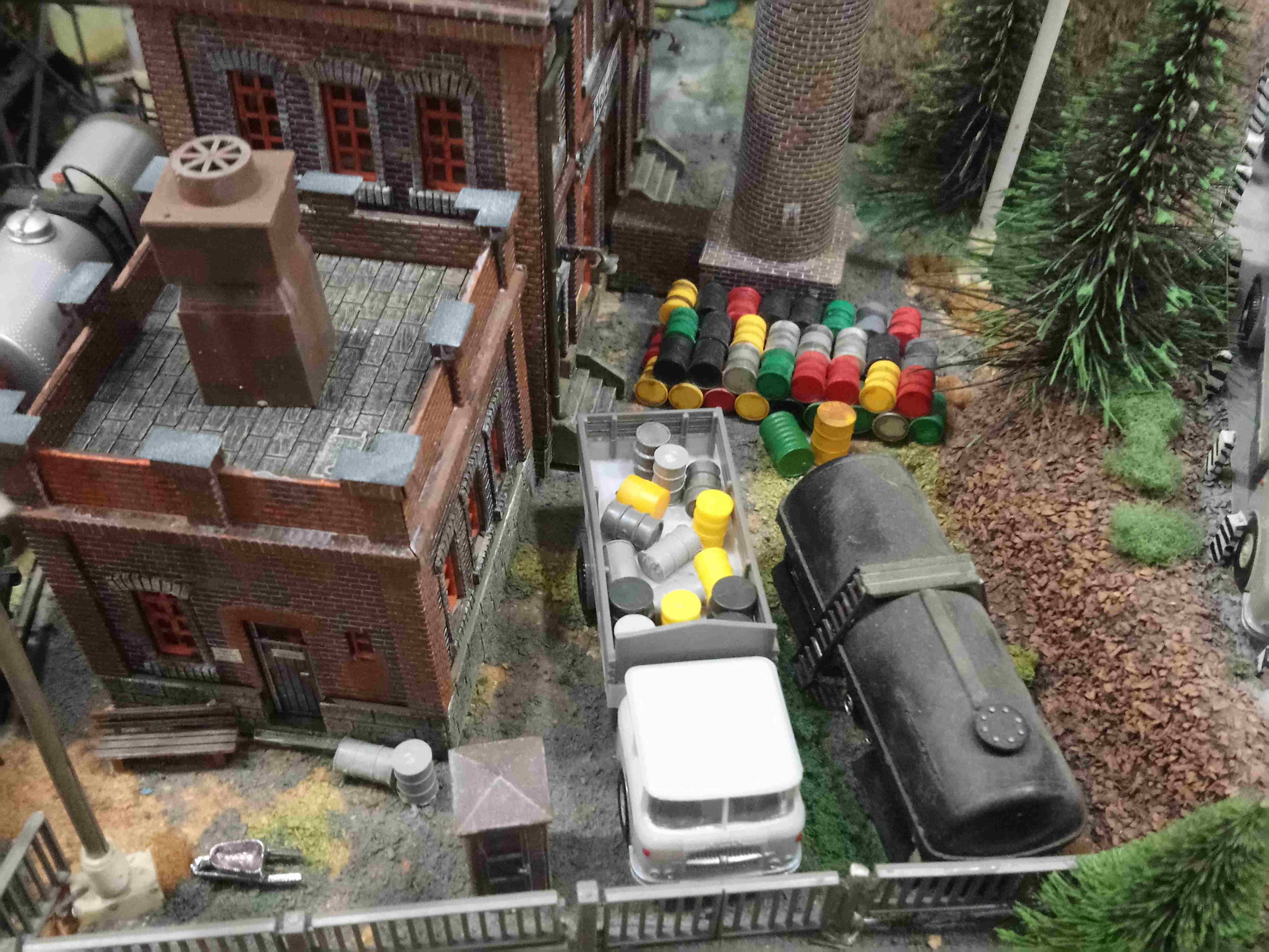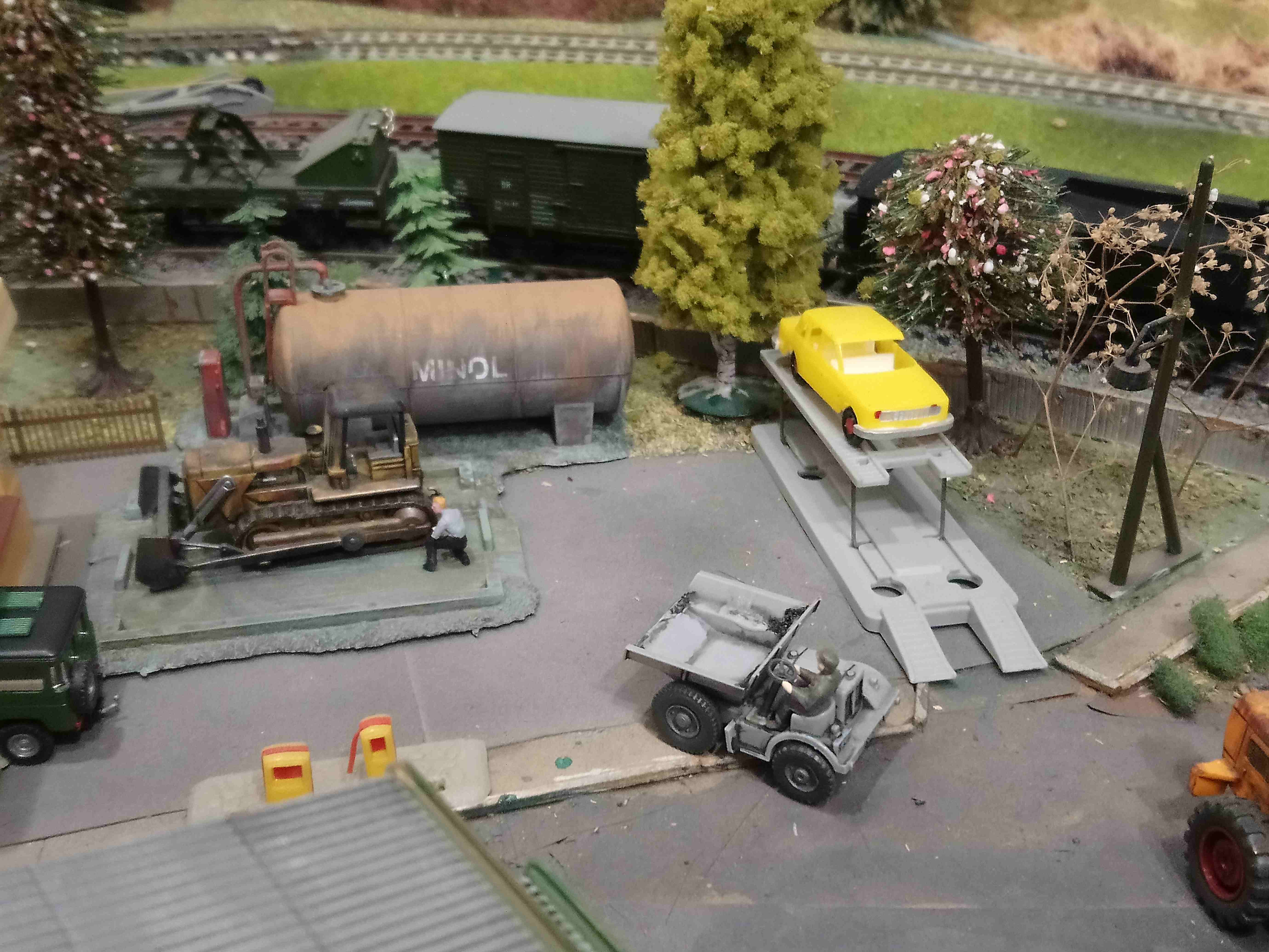 Расставил новые машинки.Баркас техпомощь расположилась у гаражей и Вольво,который на рампе. Пара авто с лесниками заправляются на заправке. Доставка грузов расположилась в жилых домах. Фронтальный самосвал катается на угольной погрузке. Также при общей,кажущейся, перенасыщености макета удалось разместить тела,на двухколесных