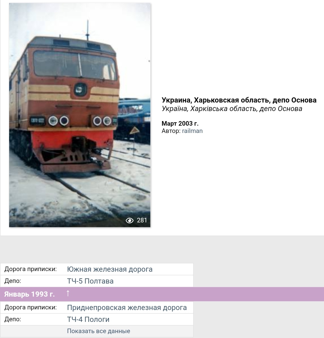 Leonid Popov писав:С завода тепловозы под номерами 0221 и 0222 поступили в депо Пологи Приднепровской жд в 1990 году. Но вскоре (по разным источникам от 1991 до 1993 года) обе были переданы на Южную дорогу.