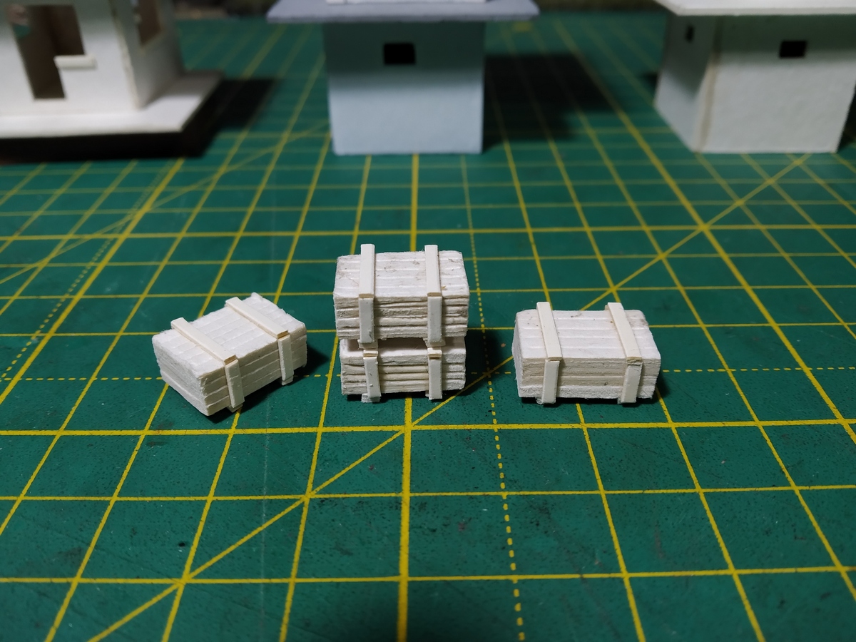 Прямоугольники из пивного картона 1,4 мм склеены пакетами по четыре слоя. В меру кривые, но вроде вполне похоже на некие ящики. Важно покрасить так, чтобы не залить, а проявить швы.