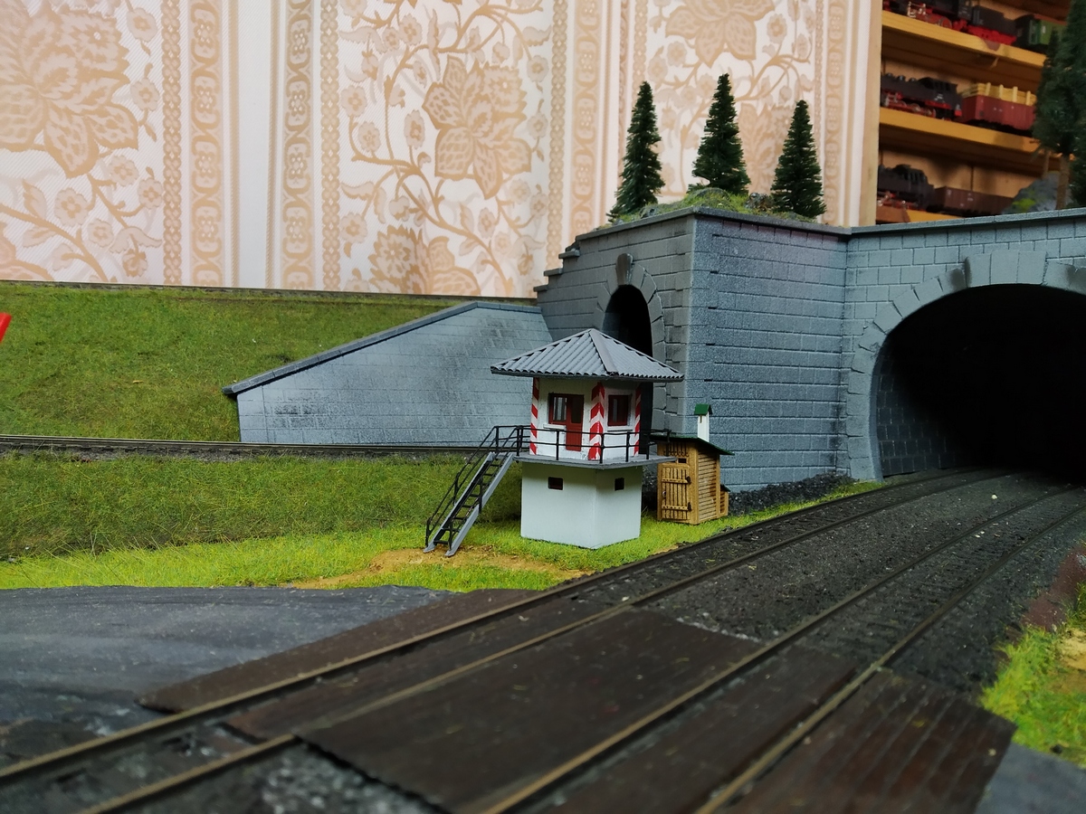 разместив его ближе к порталу тоннеля и добавив штакетный заборчик вдоль путей.