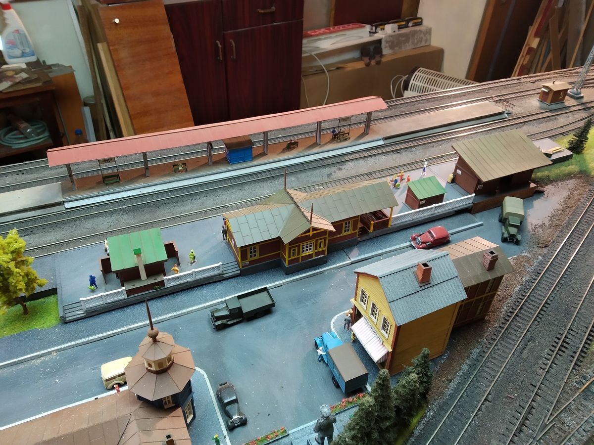На данный момент не сделаны только дымоходы. Все остальные работы в картоне завершены. Сделано остекление окон, двери и крыльцо главного входа, некие детали на крыше. Только-что установлено ограждение перрона, которое будет иметь продолжение на перрон справа, но сегодня отчёт именно о вокзале и о картоне.