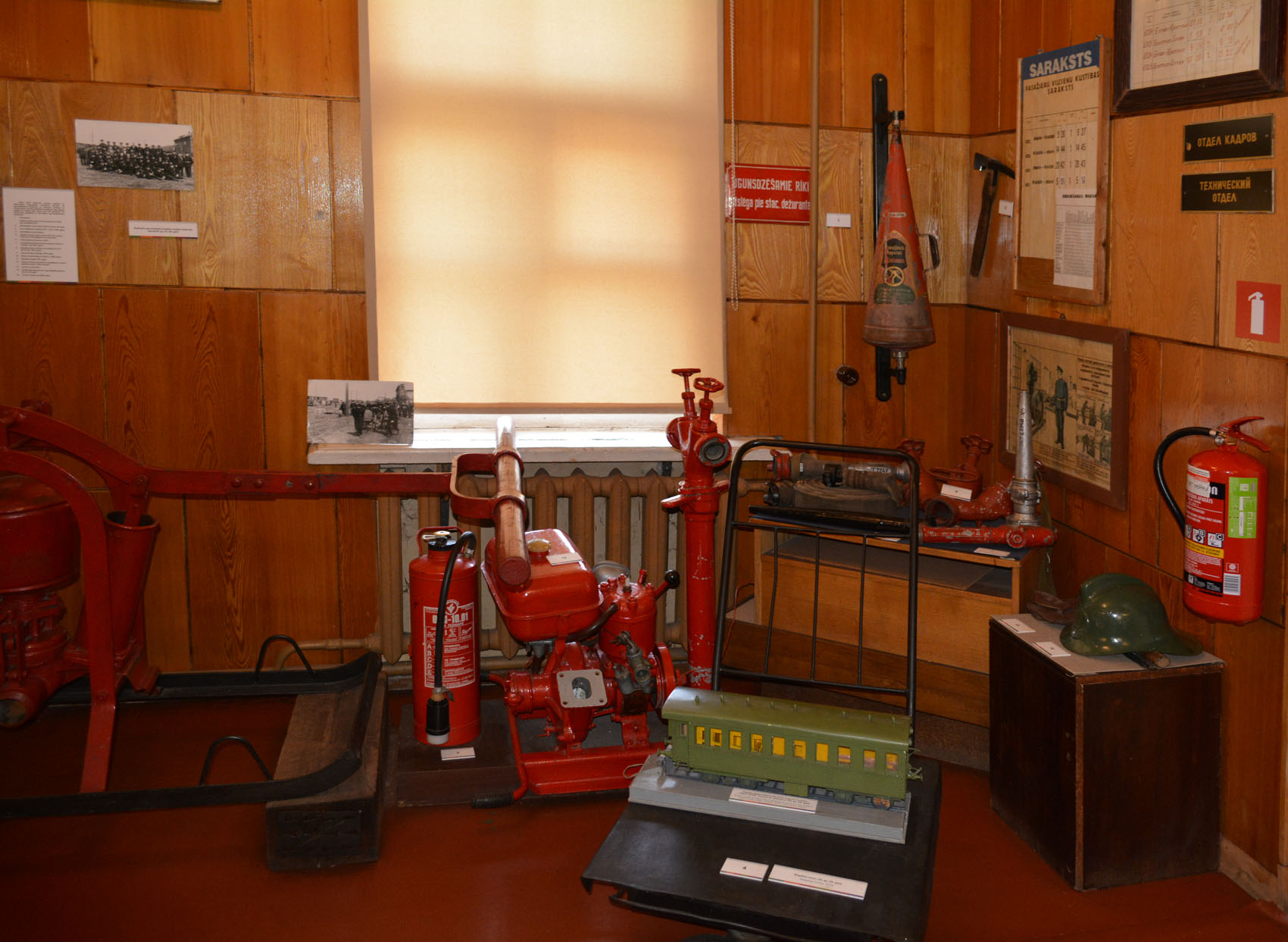 Среди экспонатов есть небольшой макет в H0, действующий. Но он такой скромный, что я постеснялся попросить включить. Странная диорамка времен Великой Отечественной, так толком и не разобрал, что хотели показать. Достаточно попсовый срез пассажирского, скорее всего, узкоколейного вагона. Крупная модель вагона (поясниловка на латышском) в отделе, посвященном пожарным, пока не понял, что это, пардон. Интересная карта былого величия латвийских дорог. У них было 5 (!) разновидностей ширины колеи. Из Риги можно было попасть в некоторые Европейские столицы напрямую.