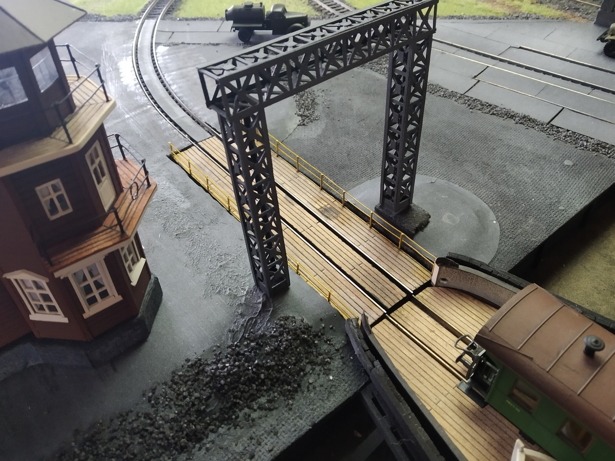 Рампа парома, в частности, обрела "деревянный" настил и поручни ограждения. Везеринг у меня, как всегда, не бесспорный. Поздно сообразил, что надо было просто накатать следы моделью автомобиля с хорошо проработанным протектором колёс.