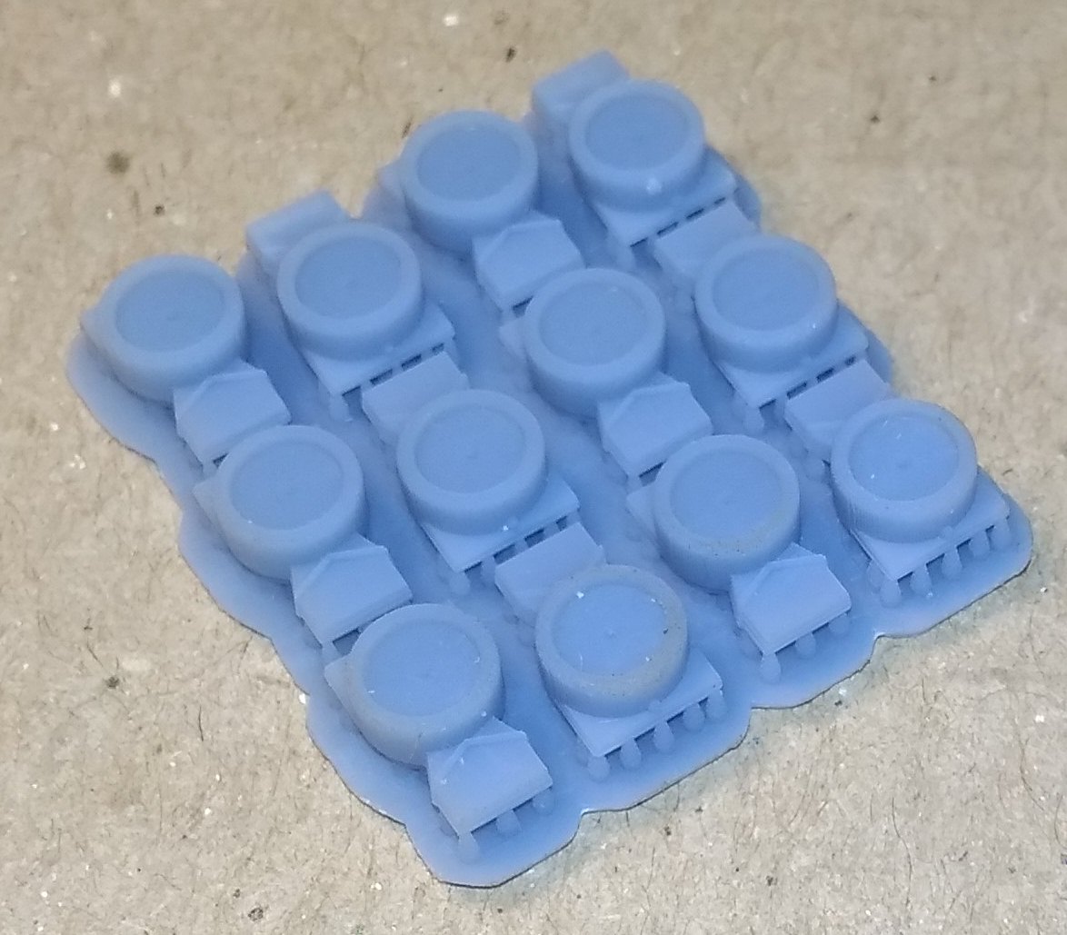 1. Нижняя крышка для локомотивов Пико Нохаб и французского скоростного электровоза CC7101. 2. Тарелки буферов для Роко. Плоские и выпуклые. 3. Вставная часть буферов современных вагонов для Лима. Для других производителей тоже должно подойти. 4. Червячная шестерня диаметром 8 мм с модулем 5. Для тепловозов Механо. Реставрирую такой, вот и пришлось сделать взамен утерянной. В основном предлагают все диаметром 6 мм, а это мало. Думаю. можно будет использовать и как насадку на вал двигателя, для прямой передачи на колпары. Больший диаметр позволяет чуть выше расположить двигатель. И, наконец, просто для показа тут, дали колесо от полуторки в масштабе 1:87. Диаметр 10,6 мм. Разработка не моя, в этом случае. Без вспышки при люминисцентном освещении получается какого-то бирюзового цвета. Но на самом деле, серый пластик.