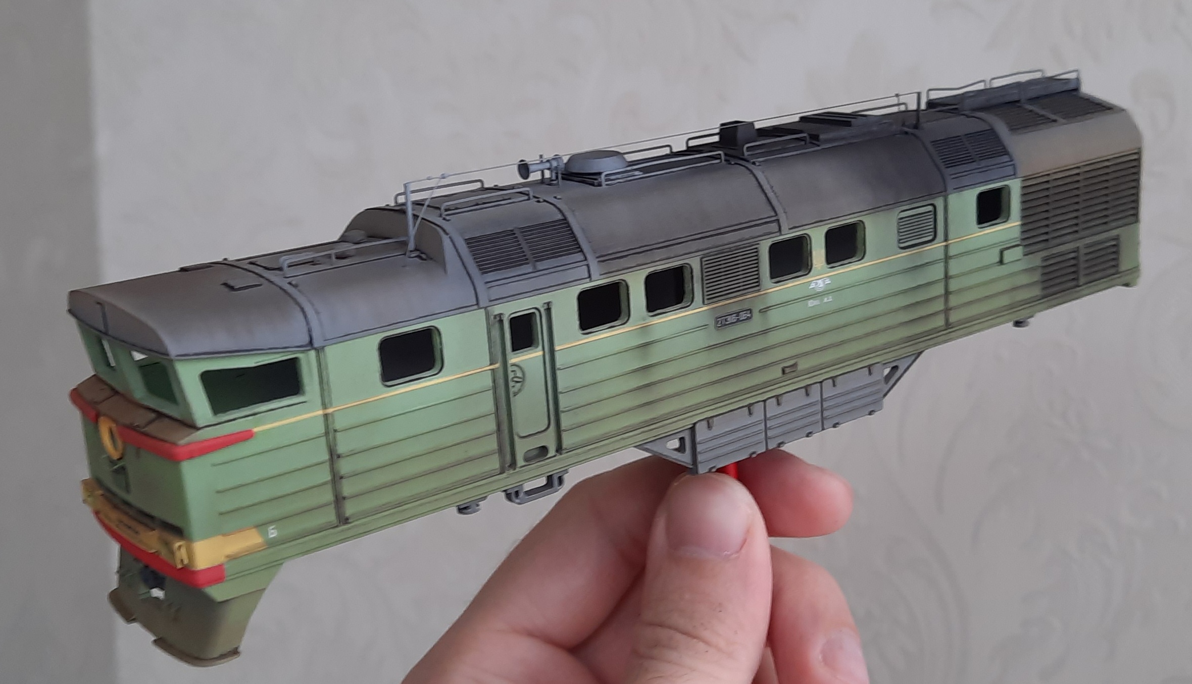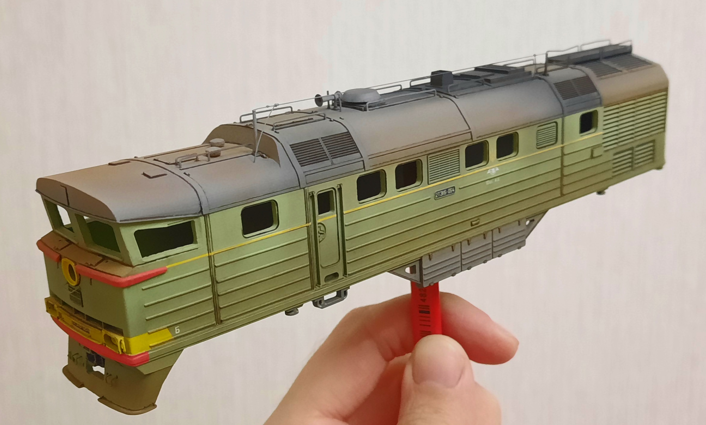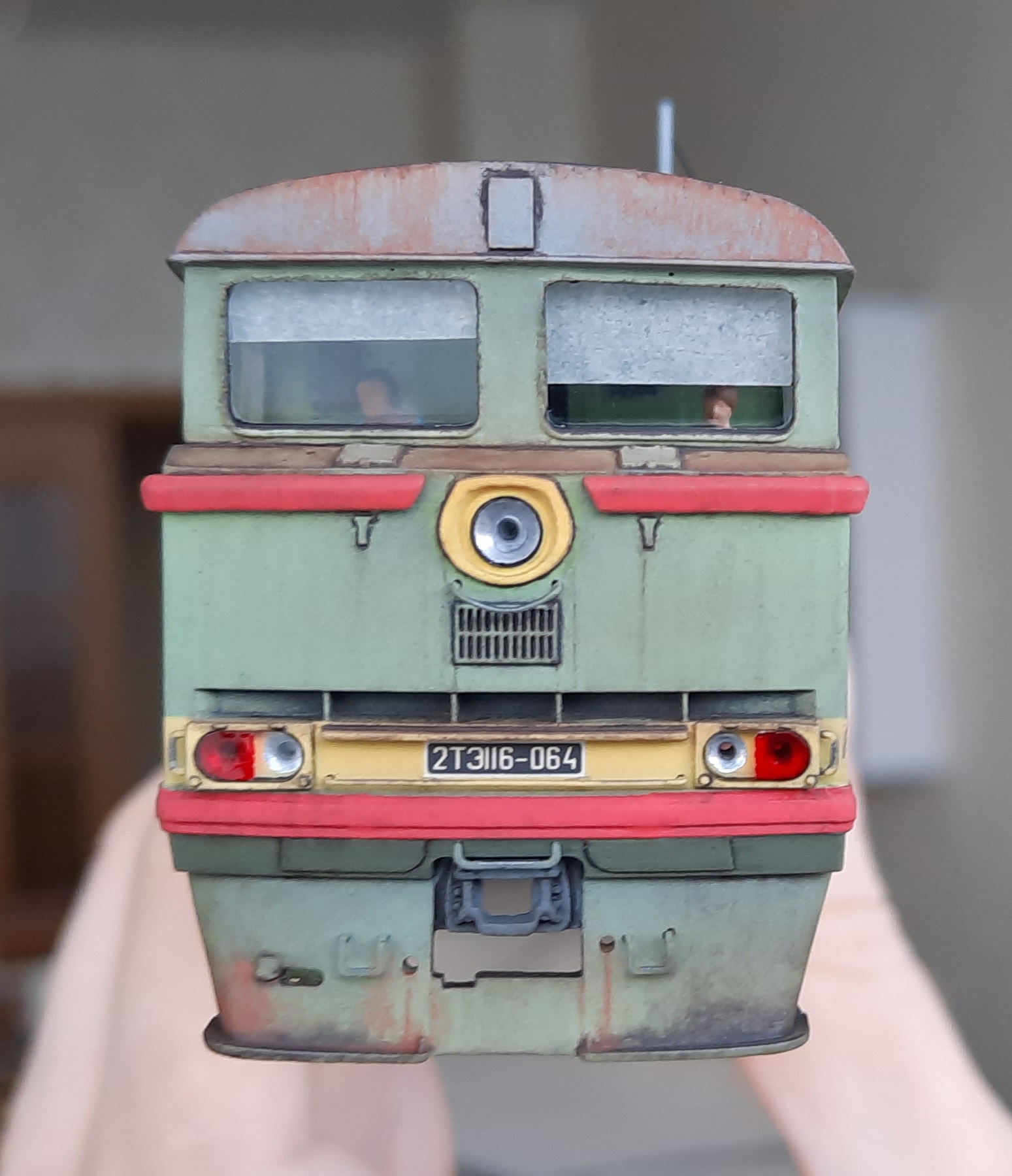 Вкрутил на место кабину с машинюгой и помогалой. Также сделал имитацию жалюзей на лобовых окнах, как у настоящих тепловозов с завода.