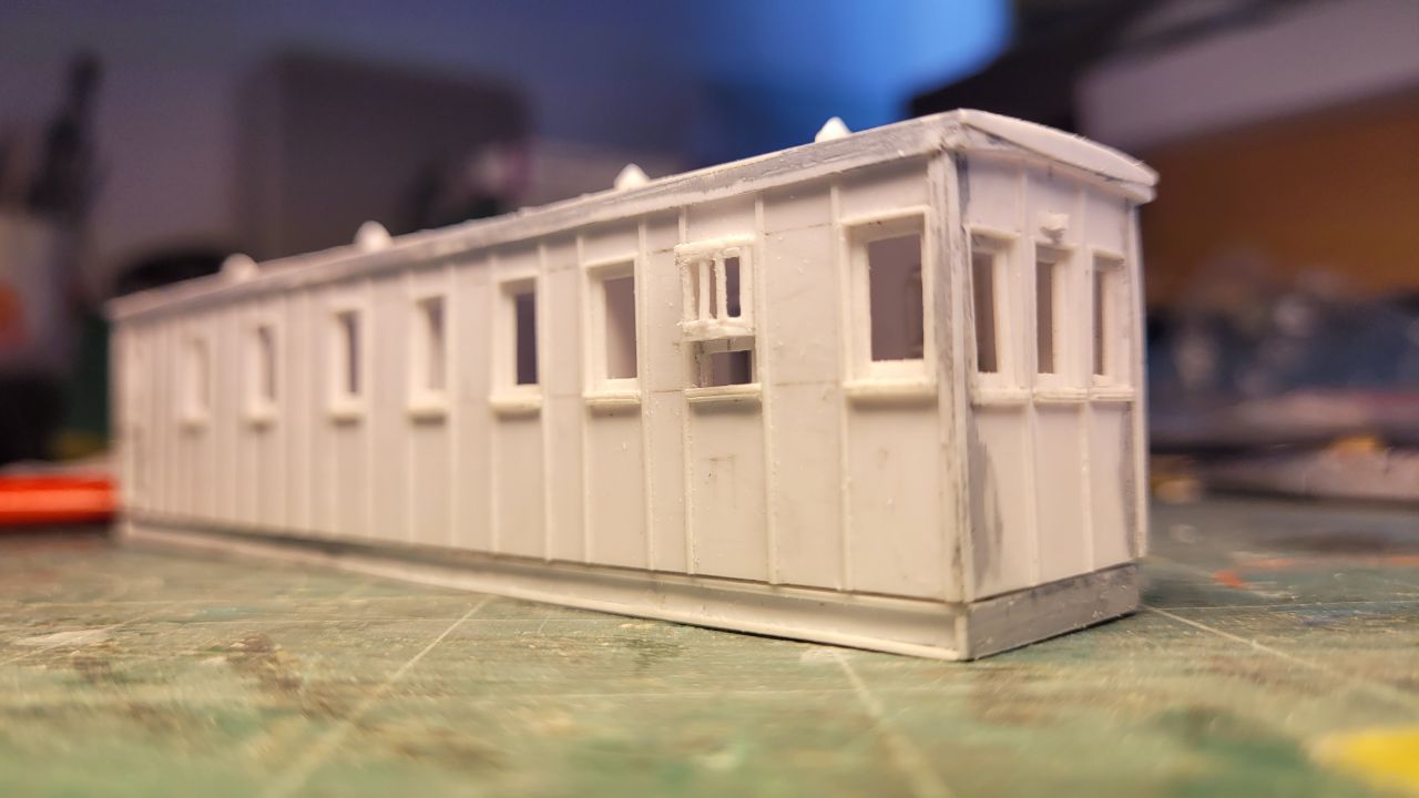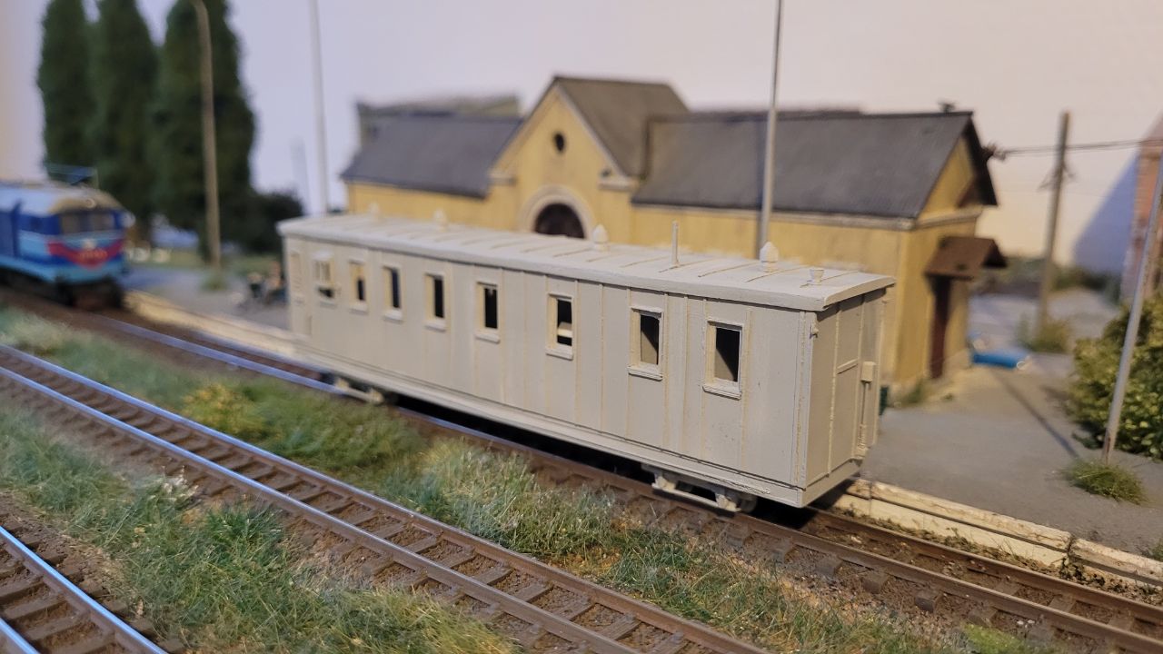 Вагон сделан полностью вручную из пластика. Из покупных деталей - только колёсные пары и винтики, на которых держатся тележки.