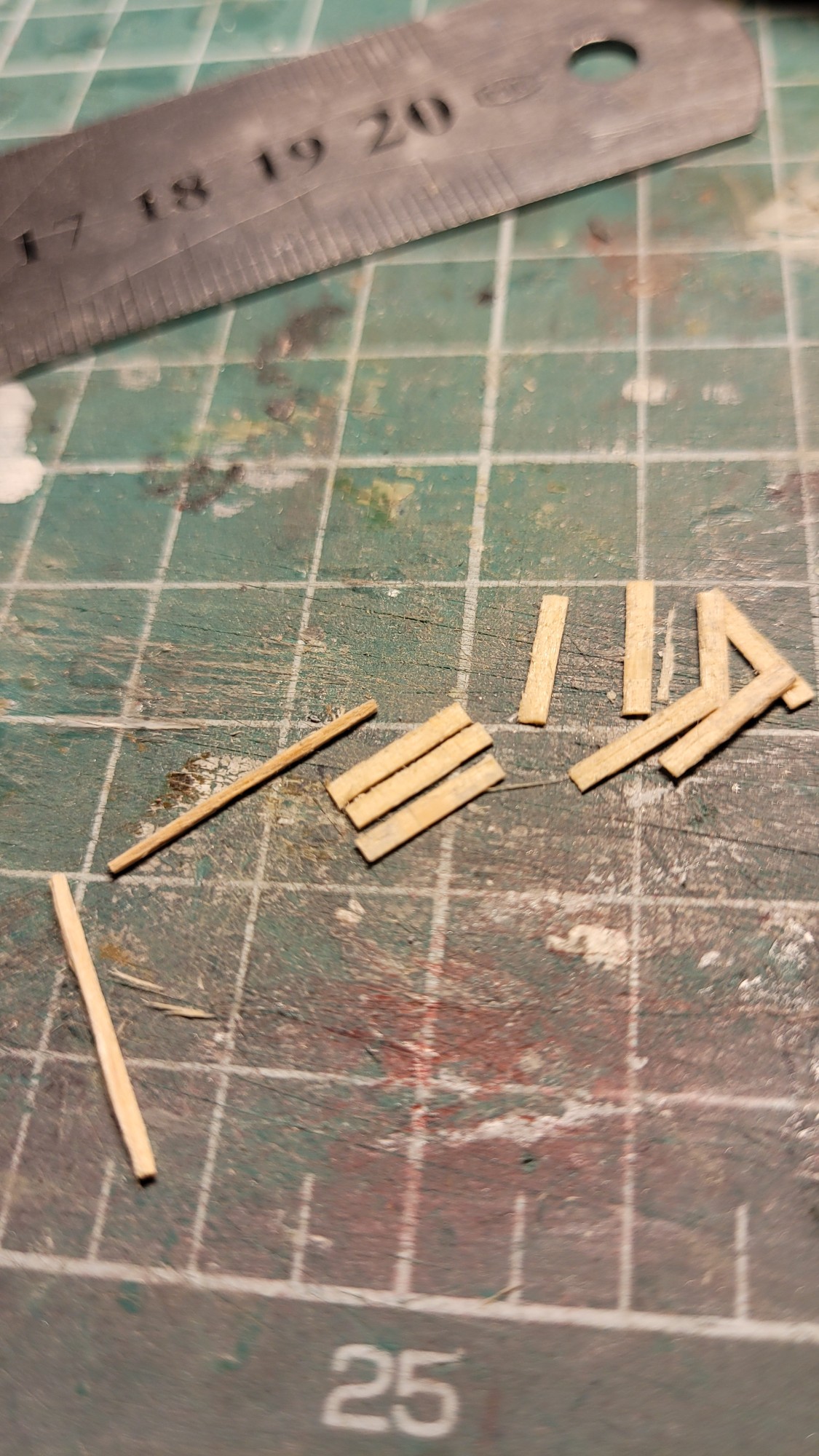 Доски вырезаны всё из той же палочки для размешивания и покрашены серой краской. Я попытался сделать имитацию мха при помощи жидкого пигмента, но получилось не очень: цвет пигмента "слегка" не совпал с ожидаемым - видно на фото. Поэтому доски я просто покрасил поверх серой краской ещё раз.