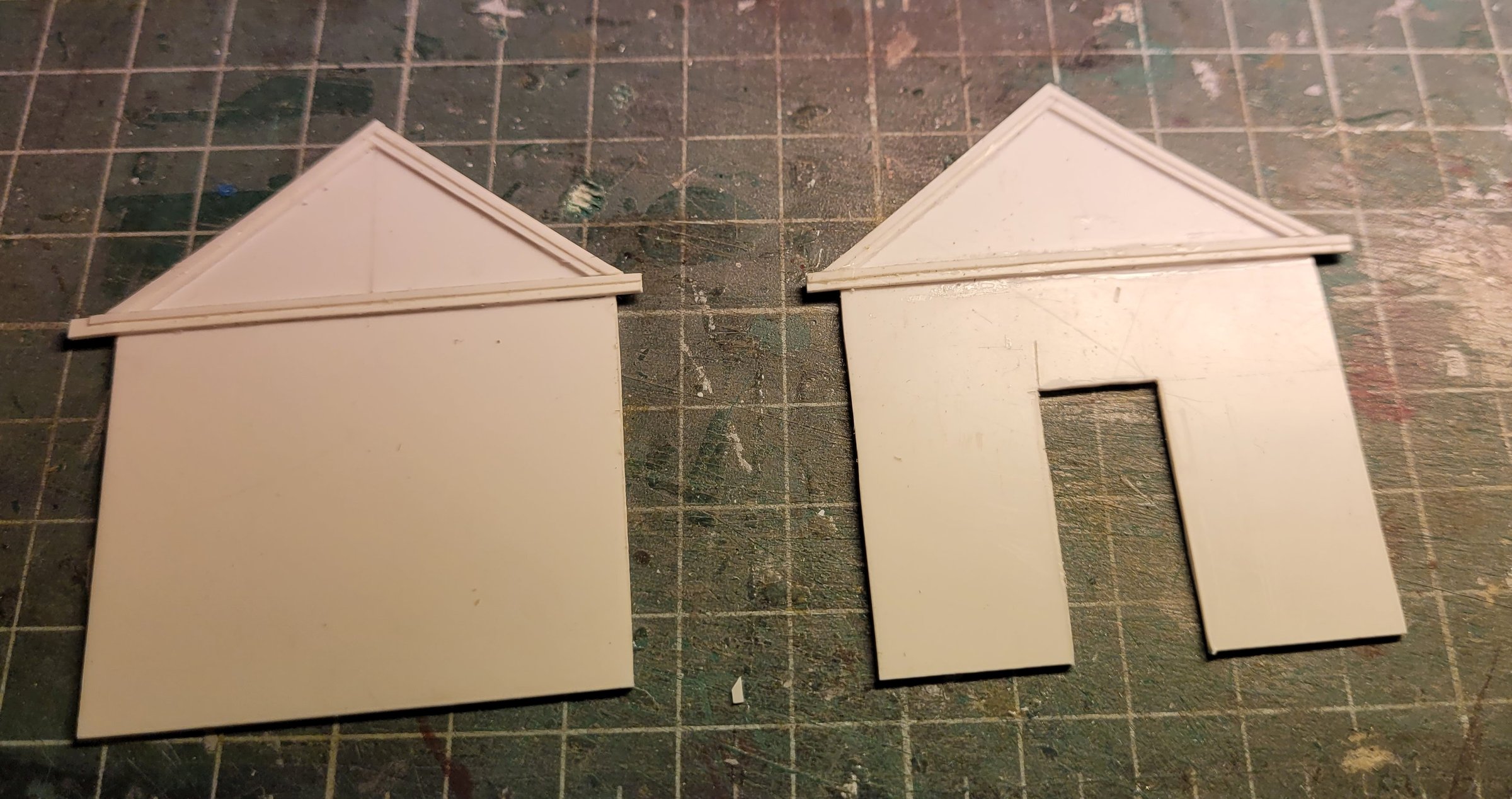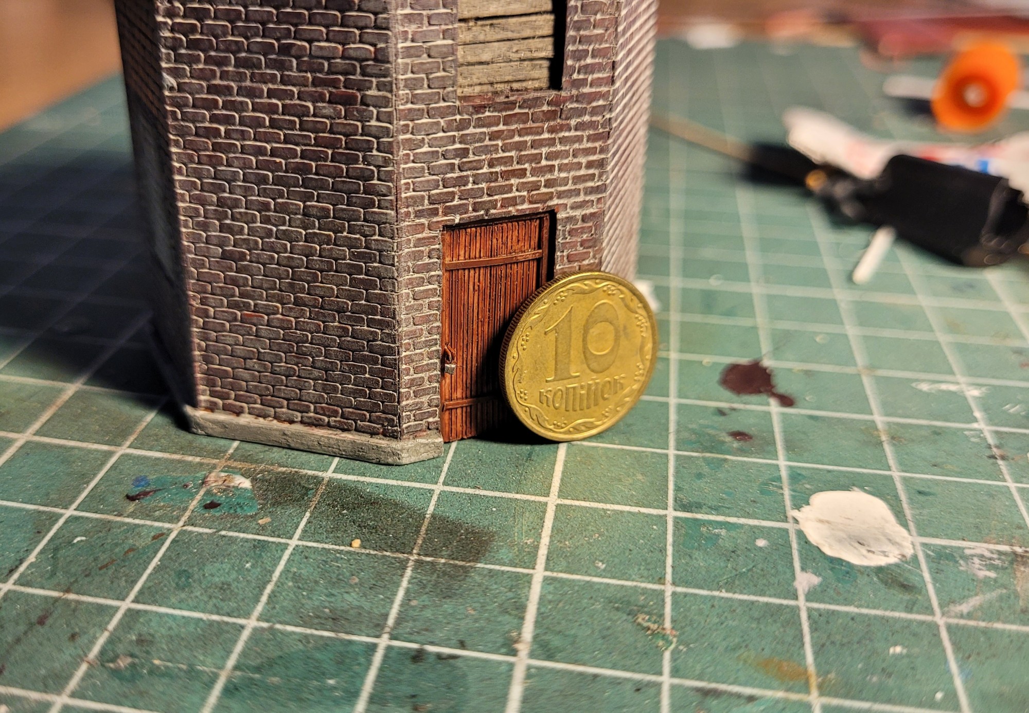 Дверь я просто вырезал из пластика 0,5 мм. Сперва саму дверь, ножом прочертил "доски". Затем подклеил пластиковый прямоугольник - основу, на которой дверь будет приклеиваться к стенам, и доклеил остальные элементы.
