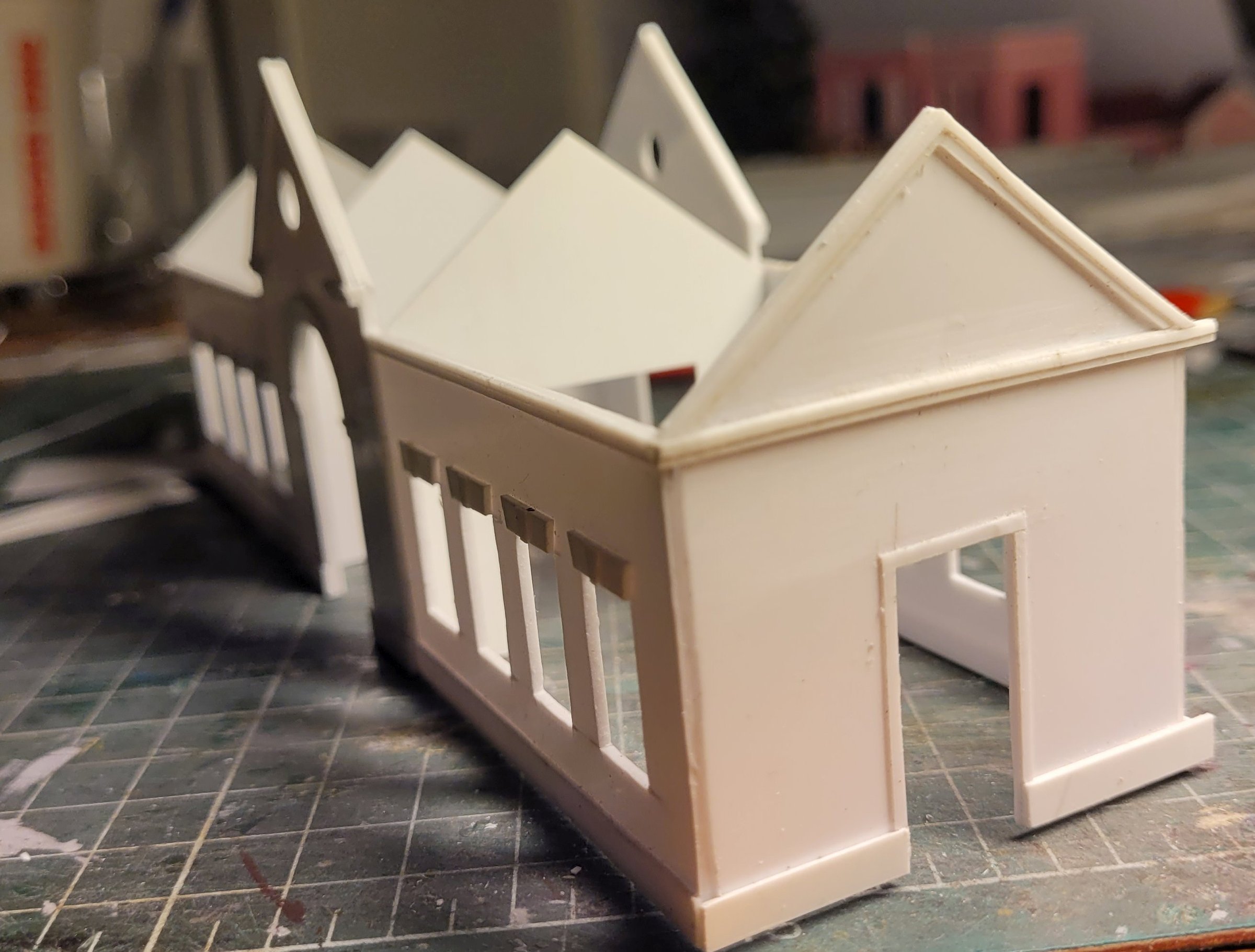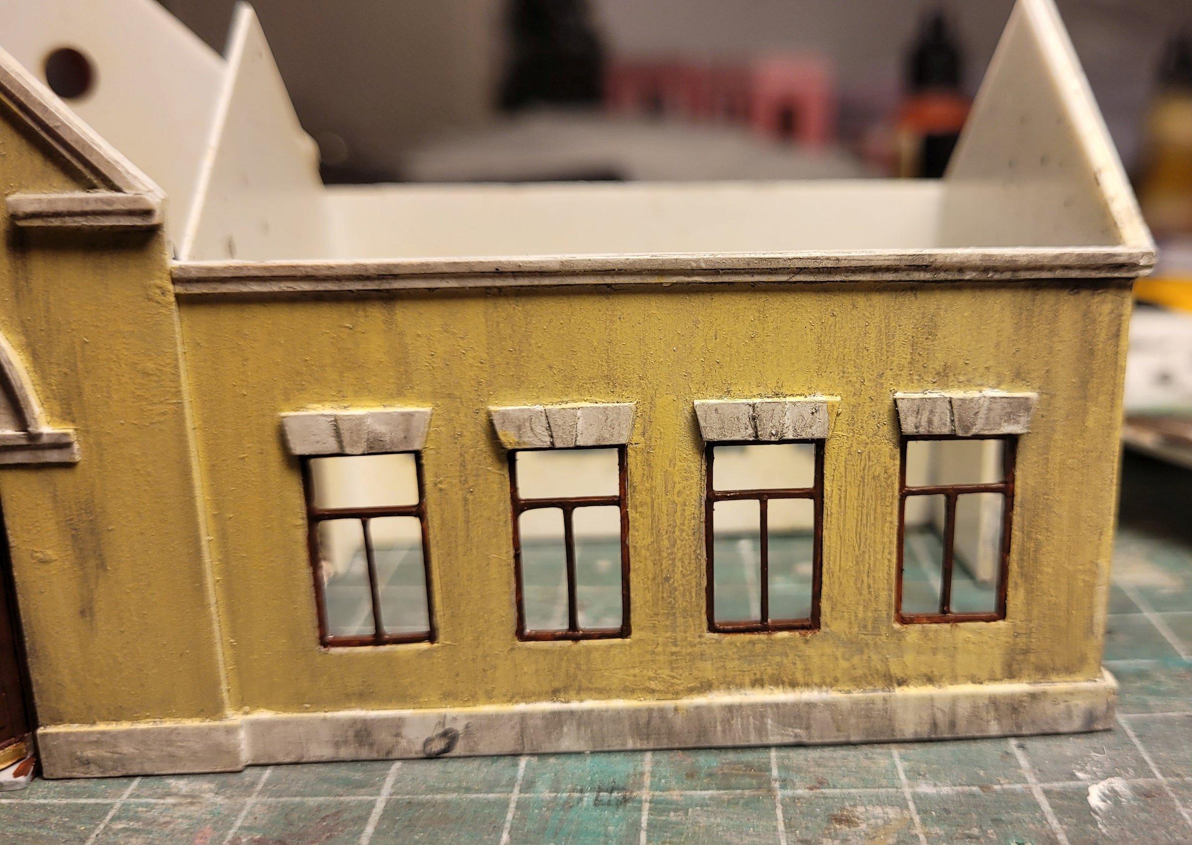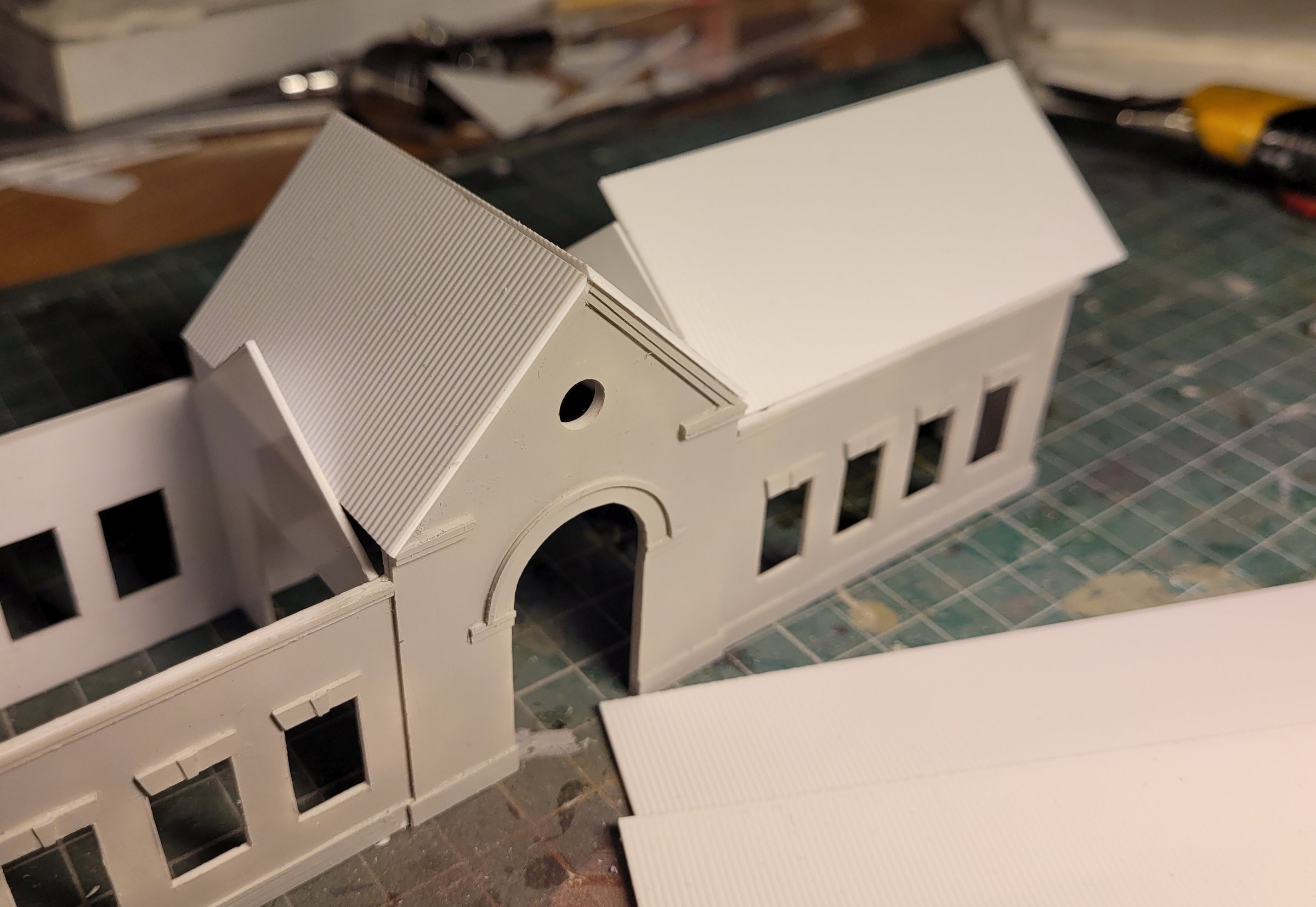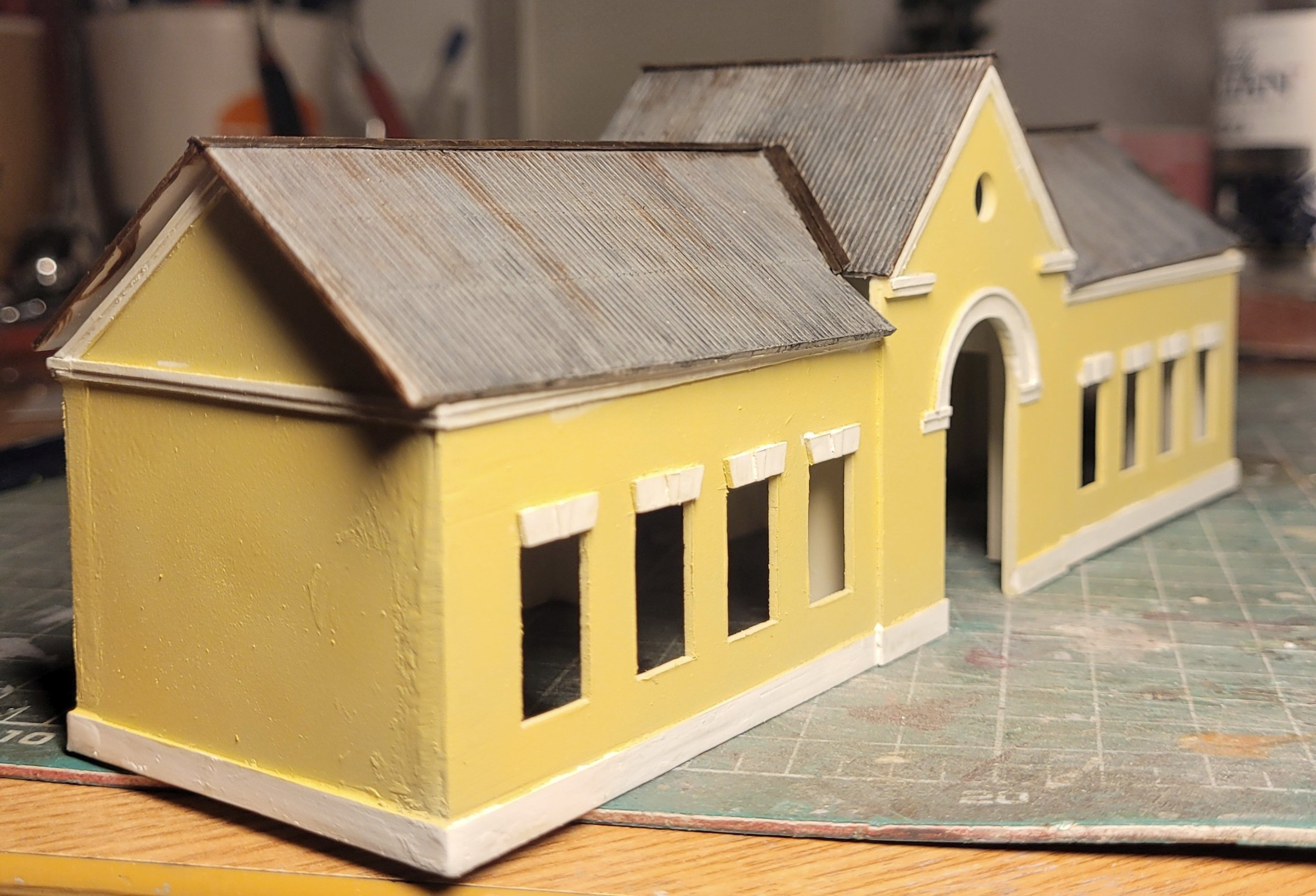 Окрашенная и состаренная крыша - примерка на здании. Заодно вокзал покрасил в светло-жёлтый цвет.